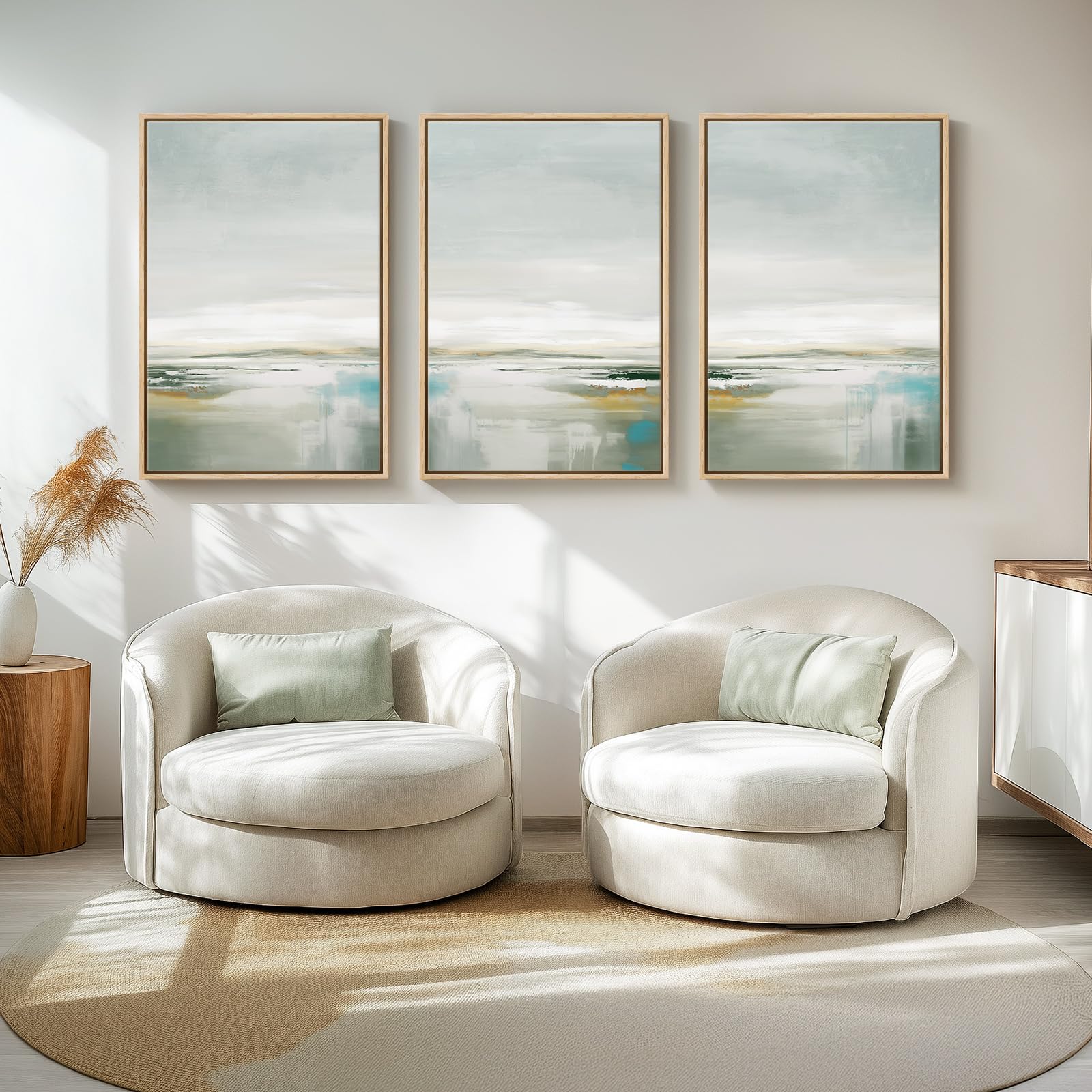 [Abstract Wall Art]: This set of abstract wall art features soft hues like light green and pale blue, created with simple yet expressive brushstrokes. The result is a tranquil, layered look that exudes elegance. Encased in a solid-wood frame, it adds natural warmth and enhances its decorative appeal. Perfect for the living room, hallway, staircase, bedroom, or office, this art elevates any space effortlessly