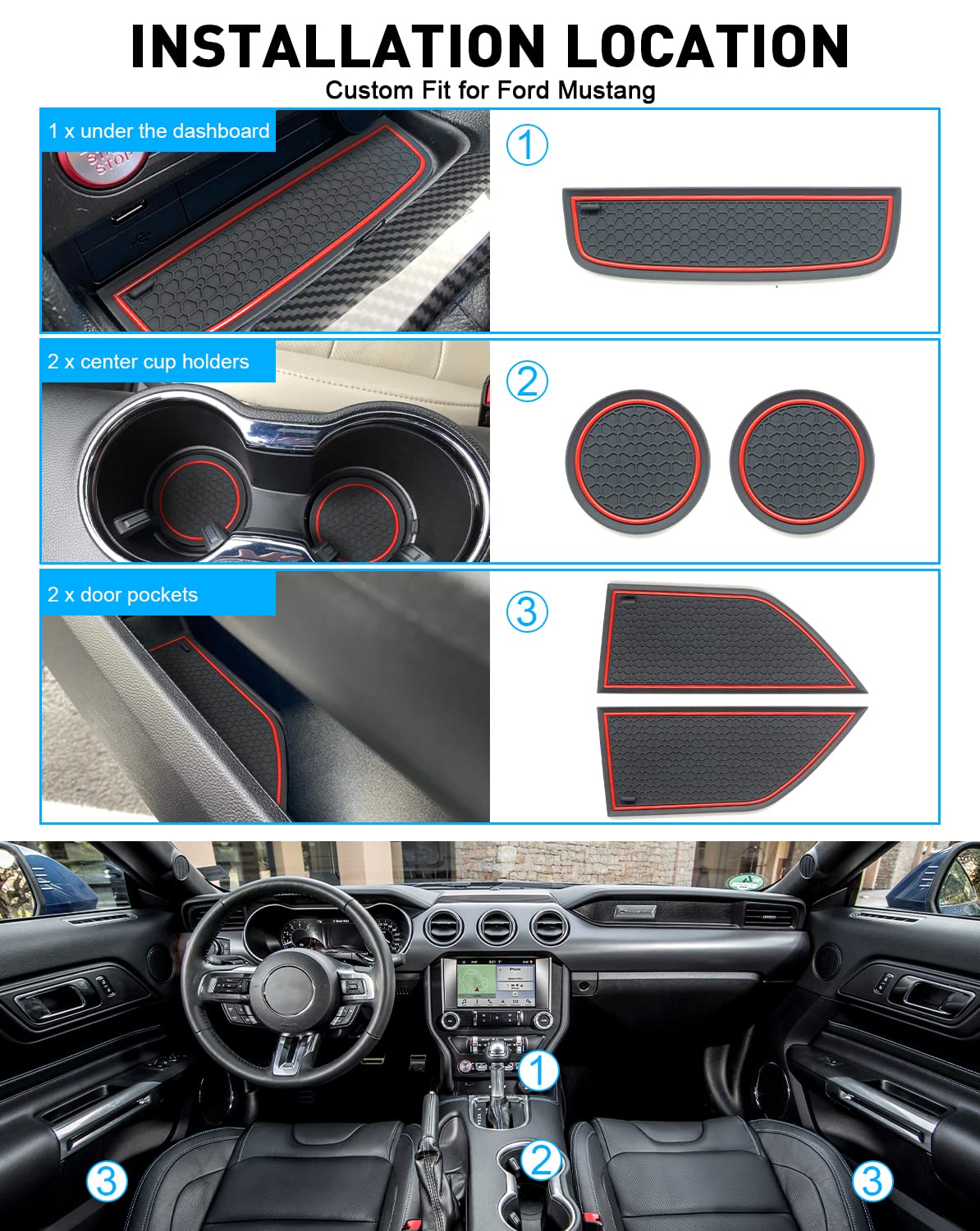 【Anti-slip & Heat-Proof】: Our Ford Mustang cup liners made of top-quality and long-lasting rubber materials.With these gripped bottom and 3D texture surface liners ,coins and keys won't slids when driving. Our Ford Mustang interior accessories were tested in hot climates, heat-proof materials make it get rid of folding or melt under high temperature from outside