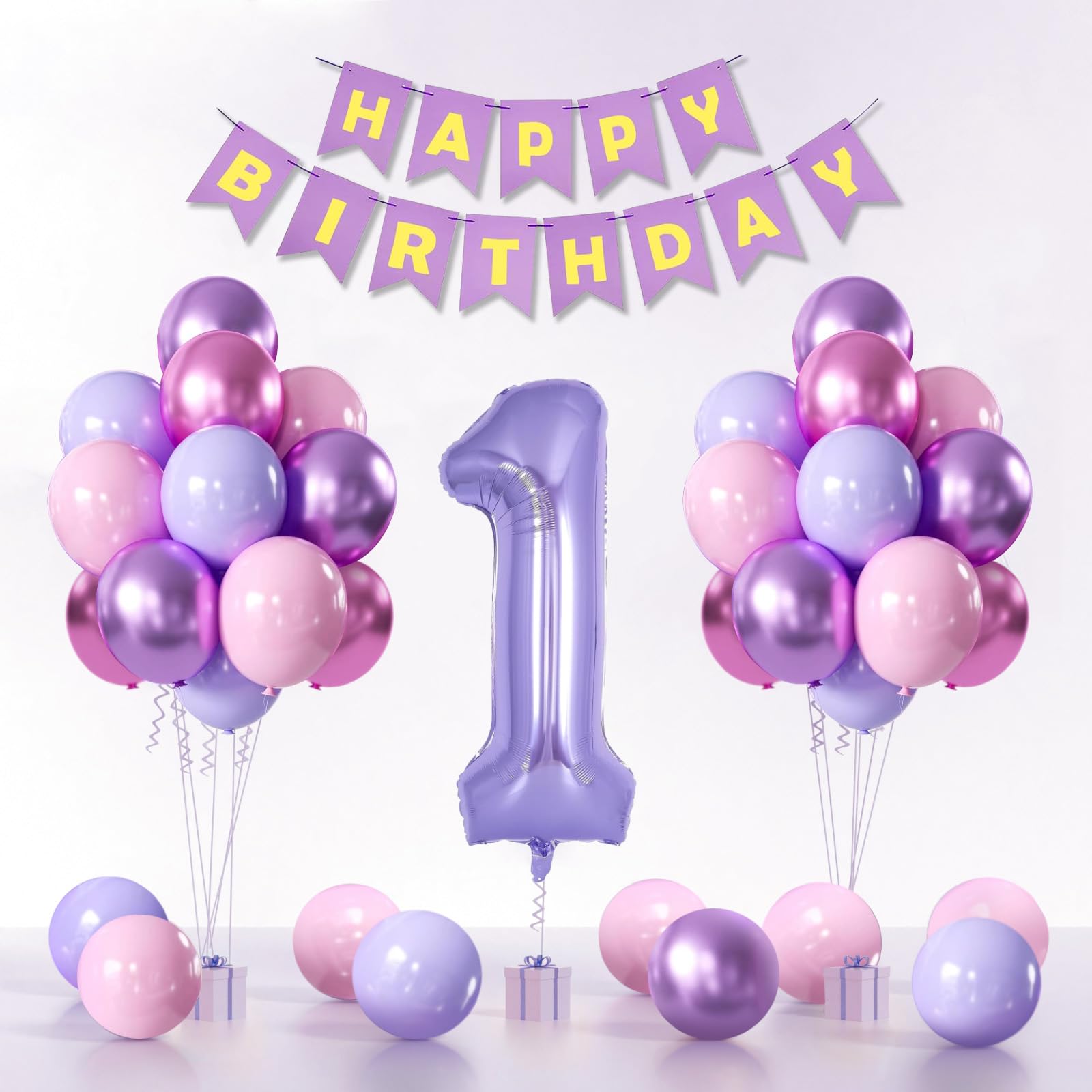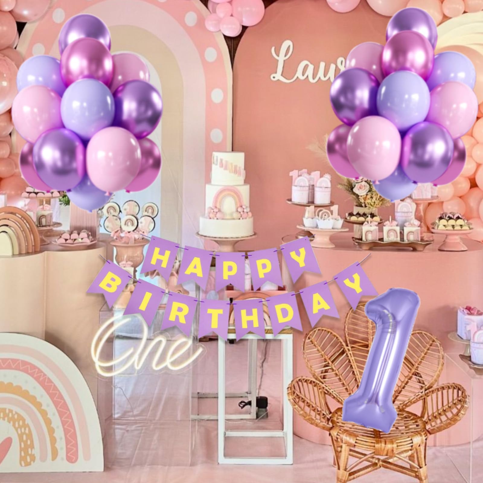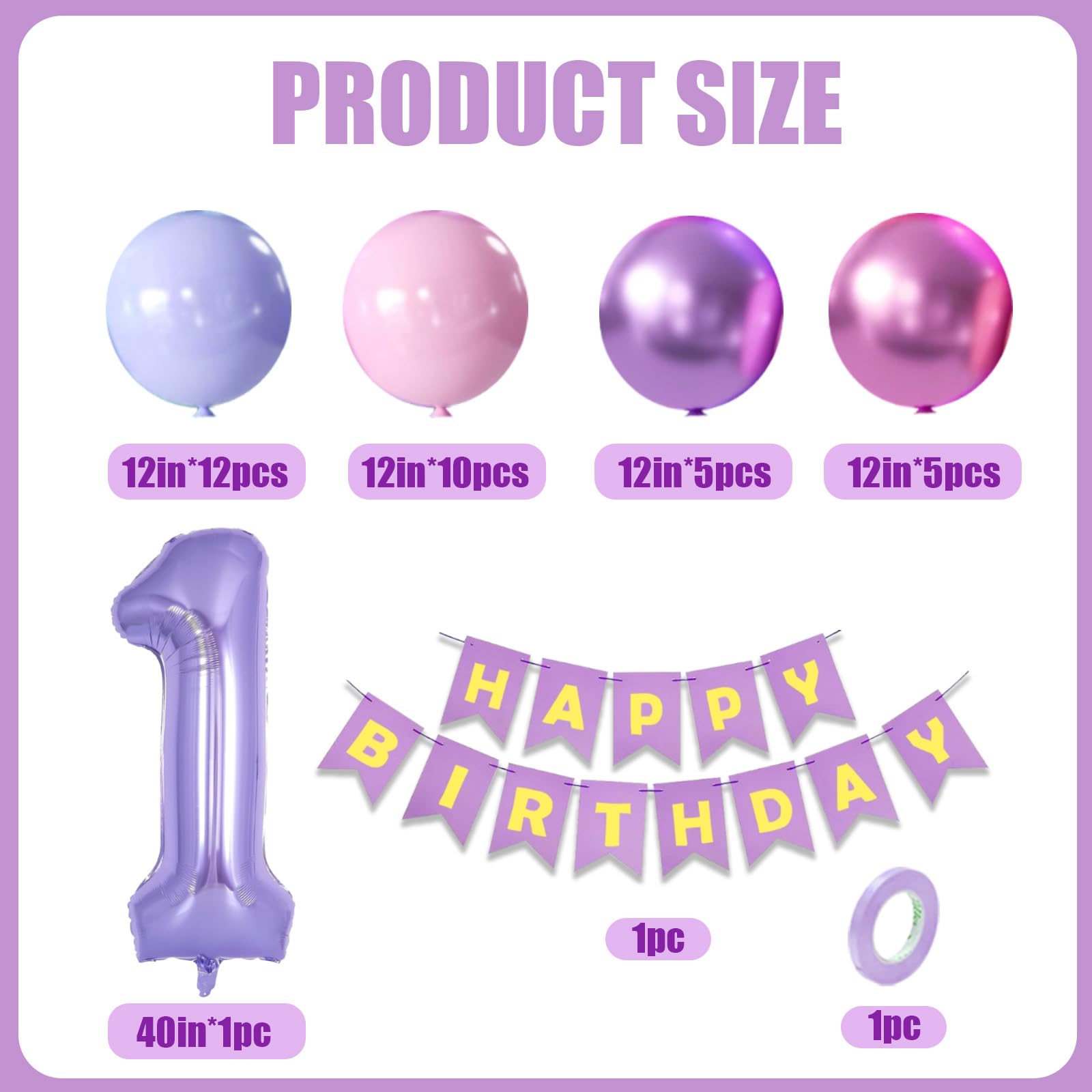 【VALUABLE PACK】38pcs One Balloon for First Birthday Kit include: 40inch purple 1 balloon,sand purple HAPPY BIRTHDAY banner, 12pcs 12inch pastel purple balloons, 10pcs 12inch pink balloons, 5pcs 12inch metallic purple and5pcs metallic pink balloons and 1 roll ribbon.