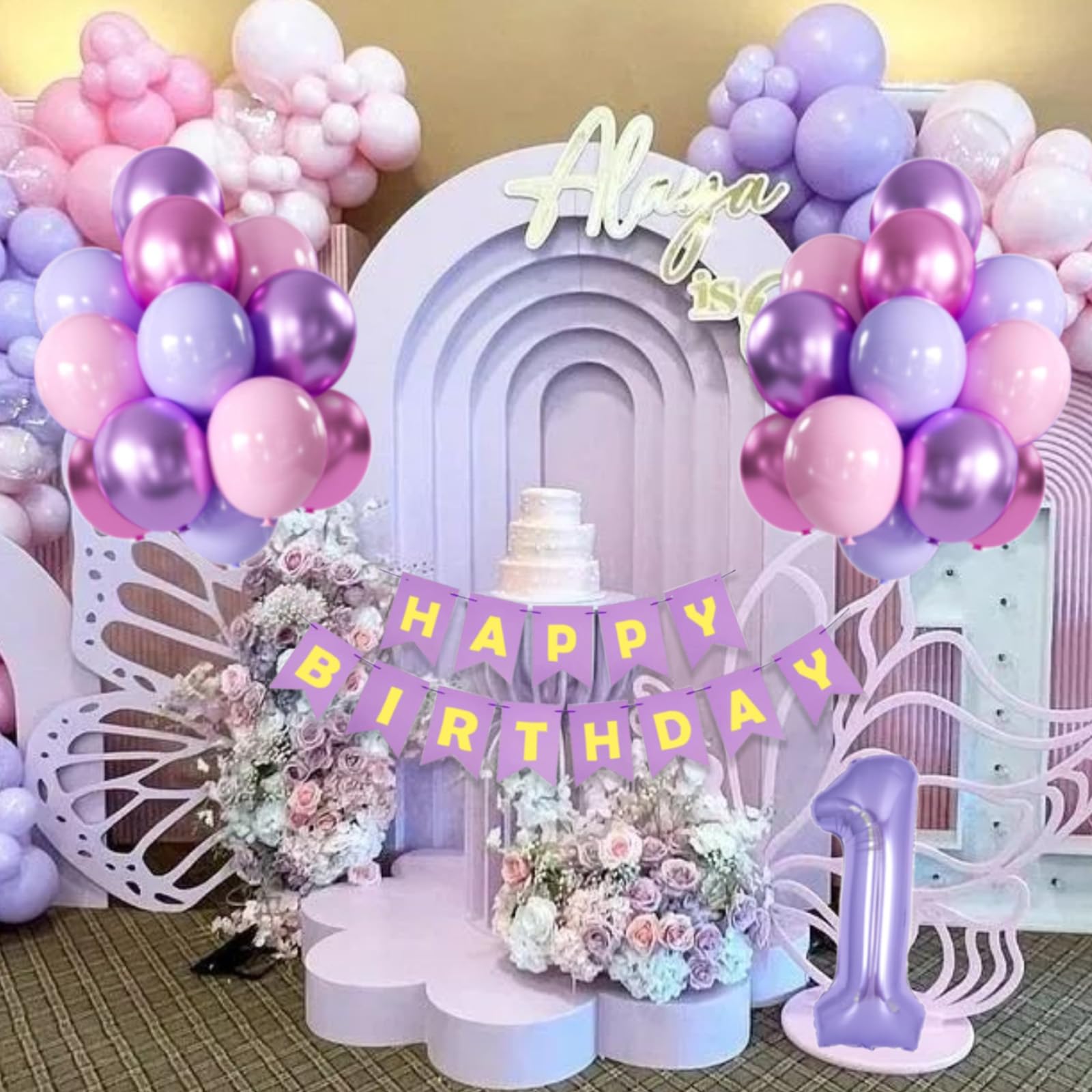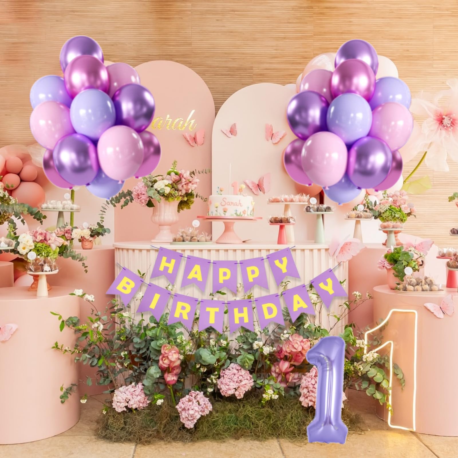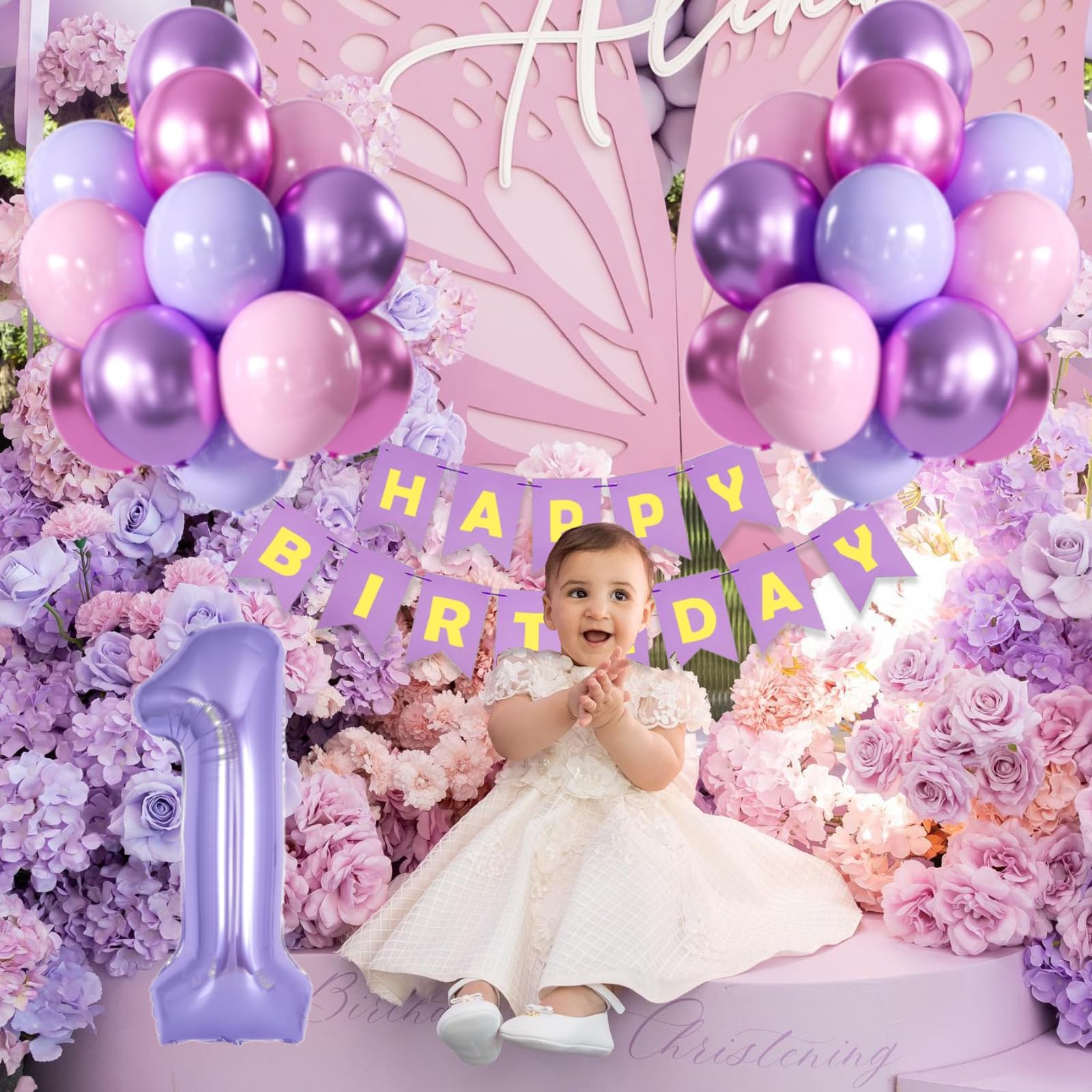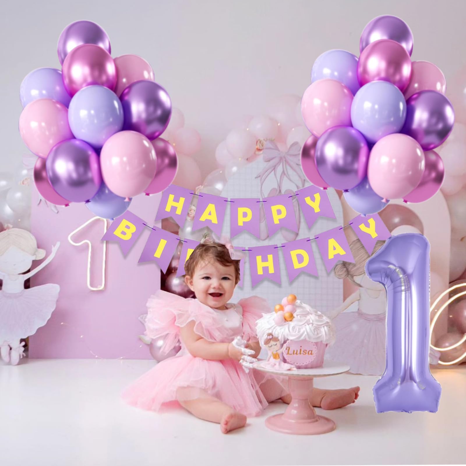 【VALUABLE PACK】38pcs One Balloon for First Birthday Kit include: 40inch purple 1 balloon,sand purple HAPPY BIRTHDAY banner, 12pcs 12inch pastel purple balloons, 10pcs 12inch pink balloons, 5pcs 12inch metallic purple and5pcs metallic pink balloons and 1 roll ribbon.