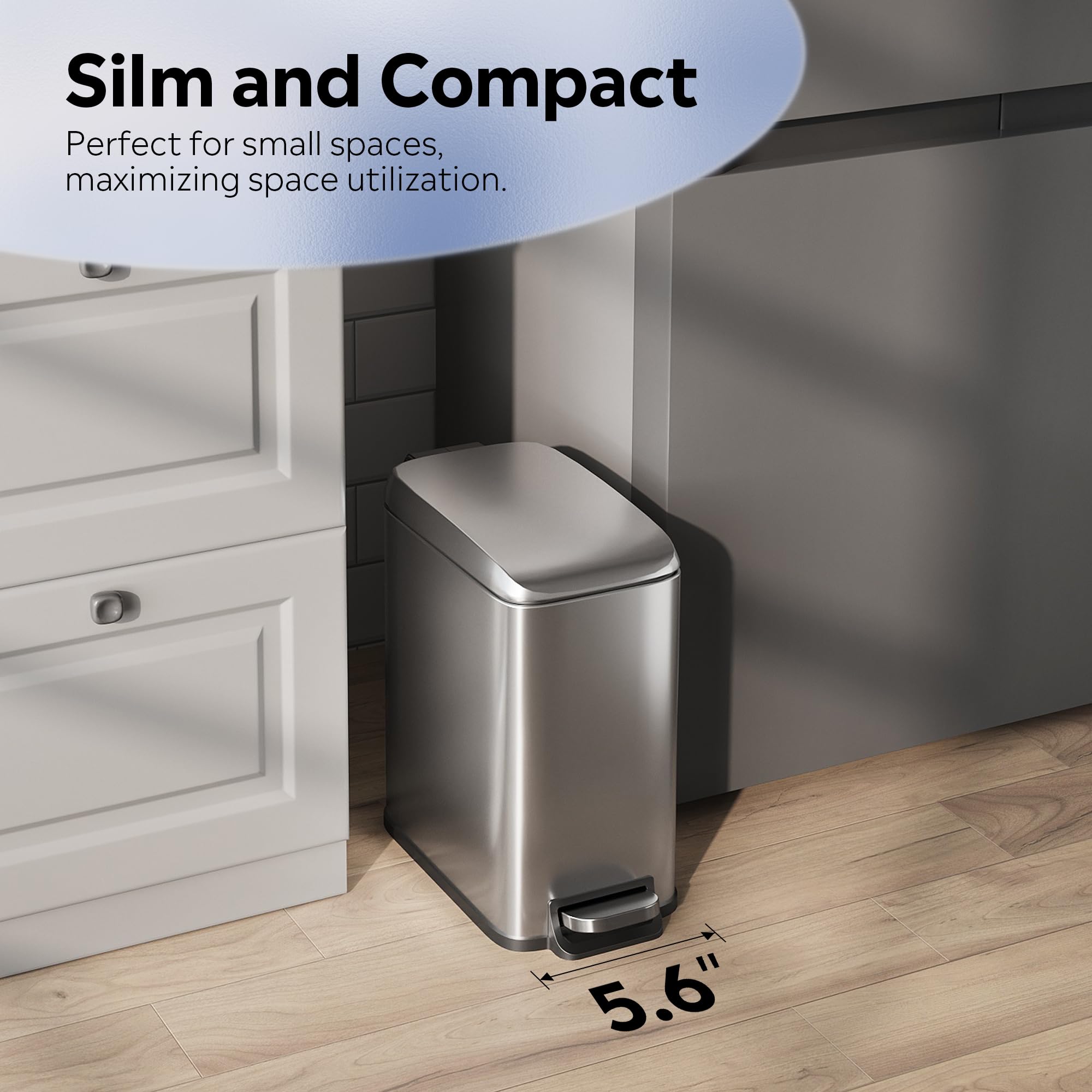 【Perfect Small Trash Can with Lid】Our 5L bathroom trash can features a slim, space-saving design that fits snugly in corners. Ideal as a compact bathroom or office garbage can, it maximizes functionality without cluttering your space.