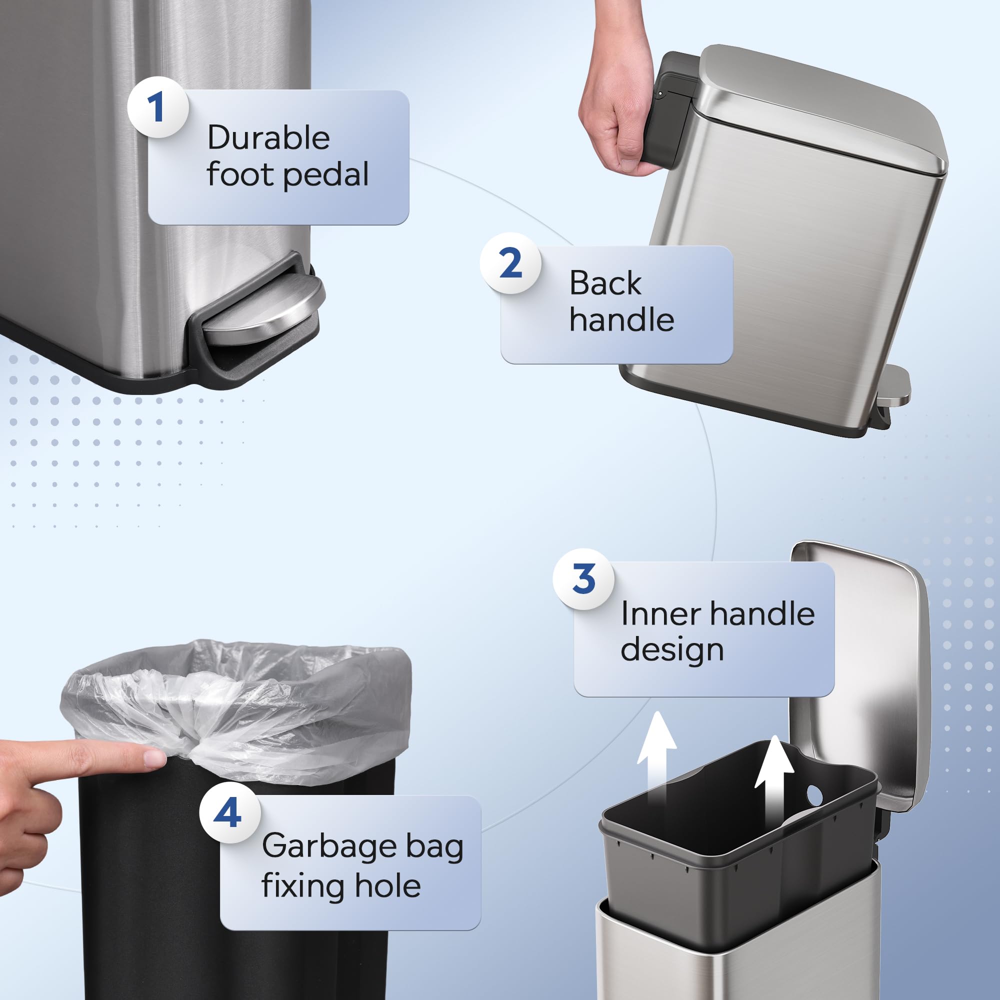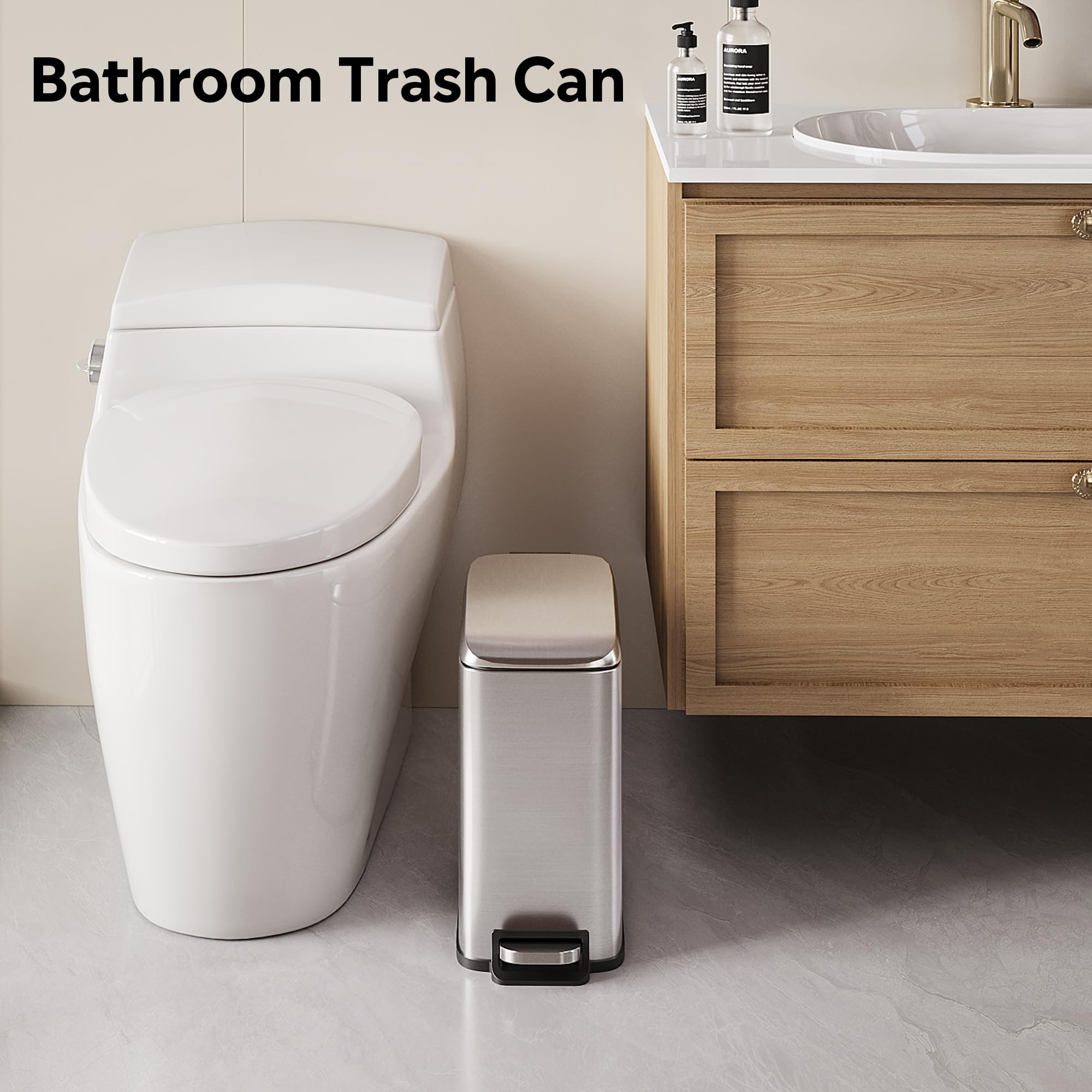 【Hands-Free Stainless Steel Trash Can】The foot pedal ensures hygienic, touch-free disposal. Built for durability with over 30,000 steps tested, this bathroom trash can with lid offers reliable, effortless operation for years.