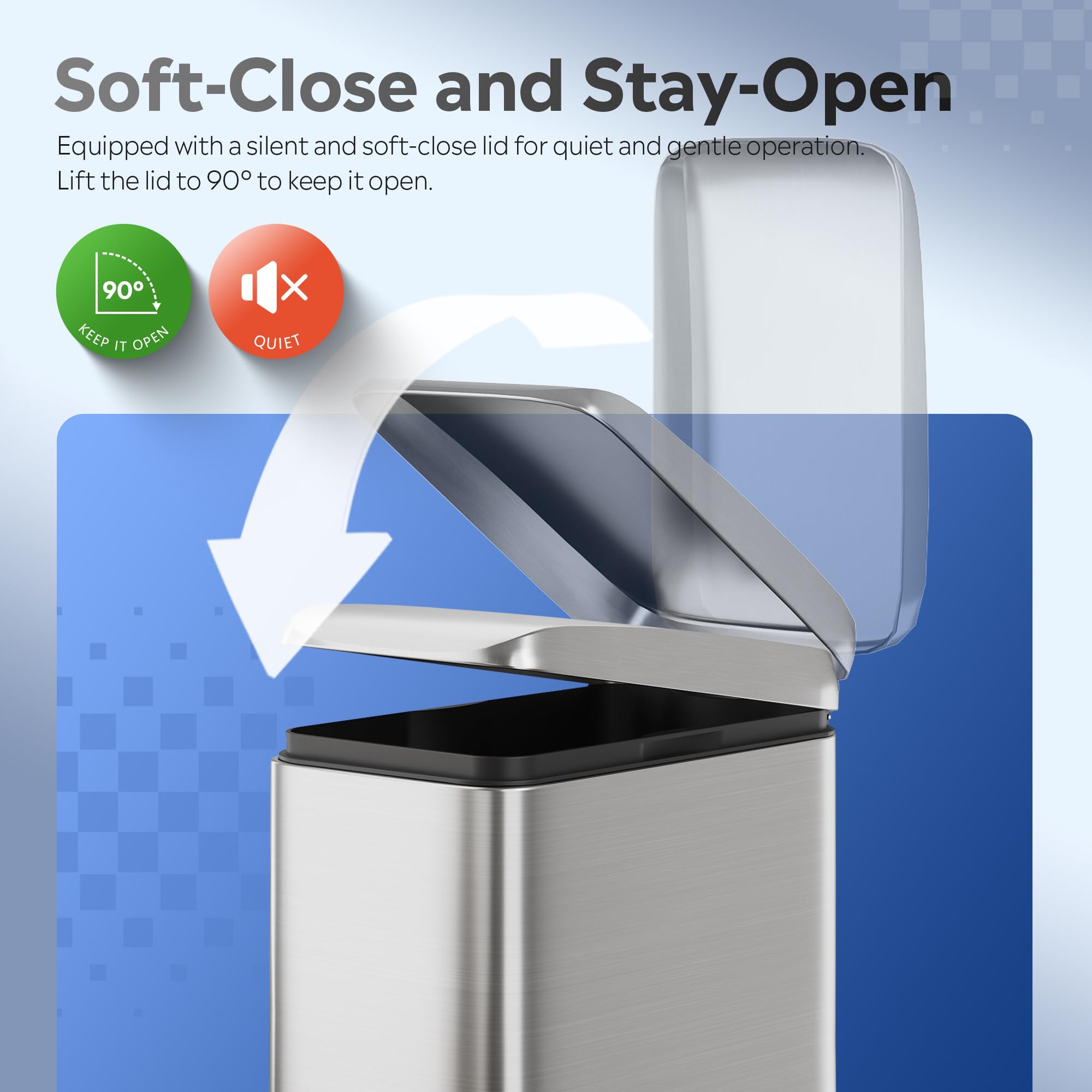 【Quiet-Close Bathroom Garbage Can】 Equipped with a soft-close lid, this stainless steel trash can closes quietly and gently. It prevents slamming, reduces noise disruption, and protects the lid and body from wear.