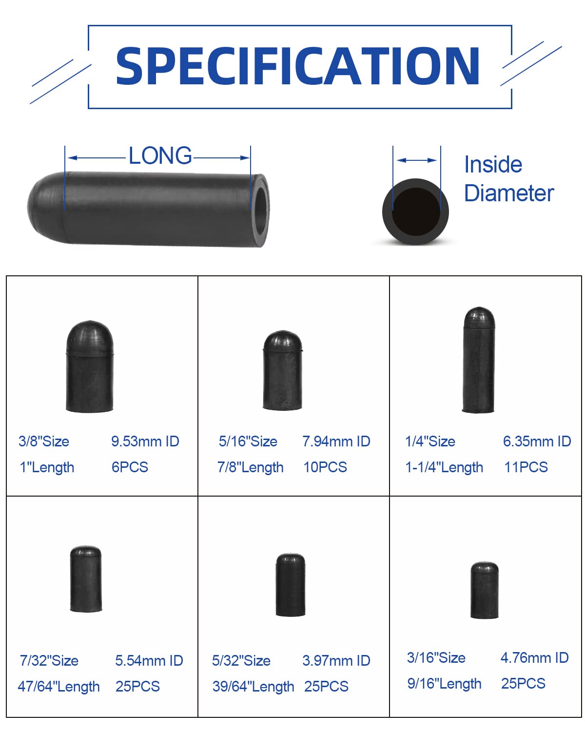 Come with 6 SIZE & 102 QUANTITY: 3/8" ID(1" Length): 6PCS, 5/16" ID(7/8" Length): 10PCS, 1/4" ID(1-1/4" Length): 11PCS, 7/32" ID(47/64" Length): 25PCS, 5/32" ID(39/64" Length): 25PCS, 3/16" ID(11/16" Length): 25PCS