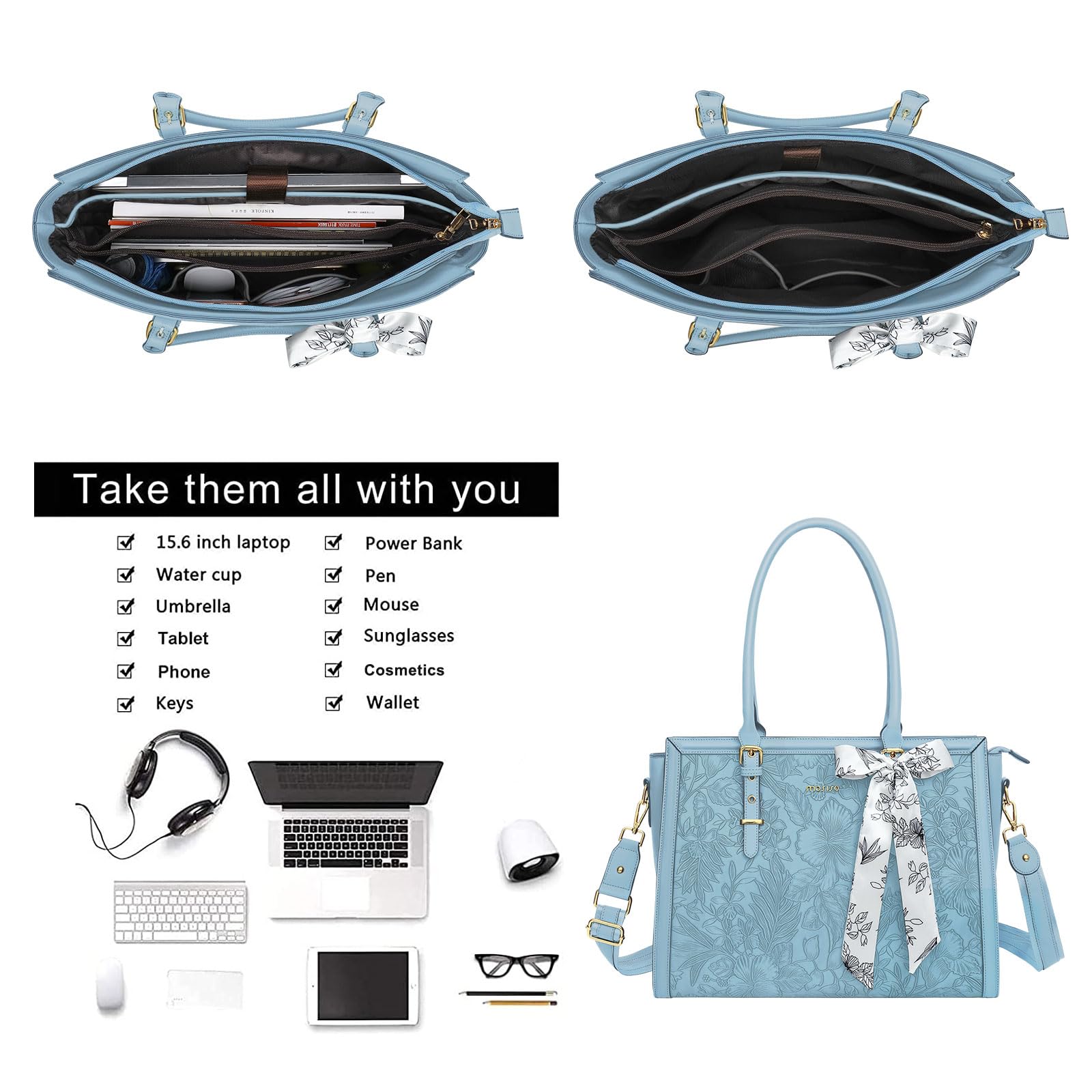 Roomy enough with 3 compartments for all your daily stuff. The computer compartment in the middle provides a thick padded foam section with a hook & loop strap closure for your laptop or tablet. Professional design to protect your laptop against accidental impacts and scratches. The other two side compartments & matching color small pouch case can store your jewelry, mobile phone, keys, mouse, passports, credit cards, cash, makeups and so on.