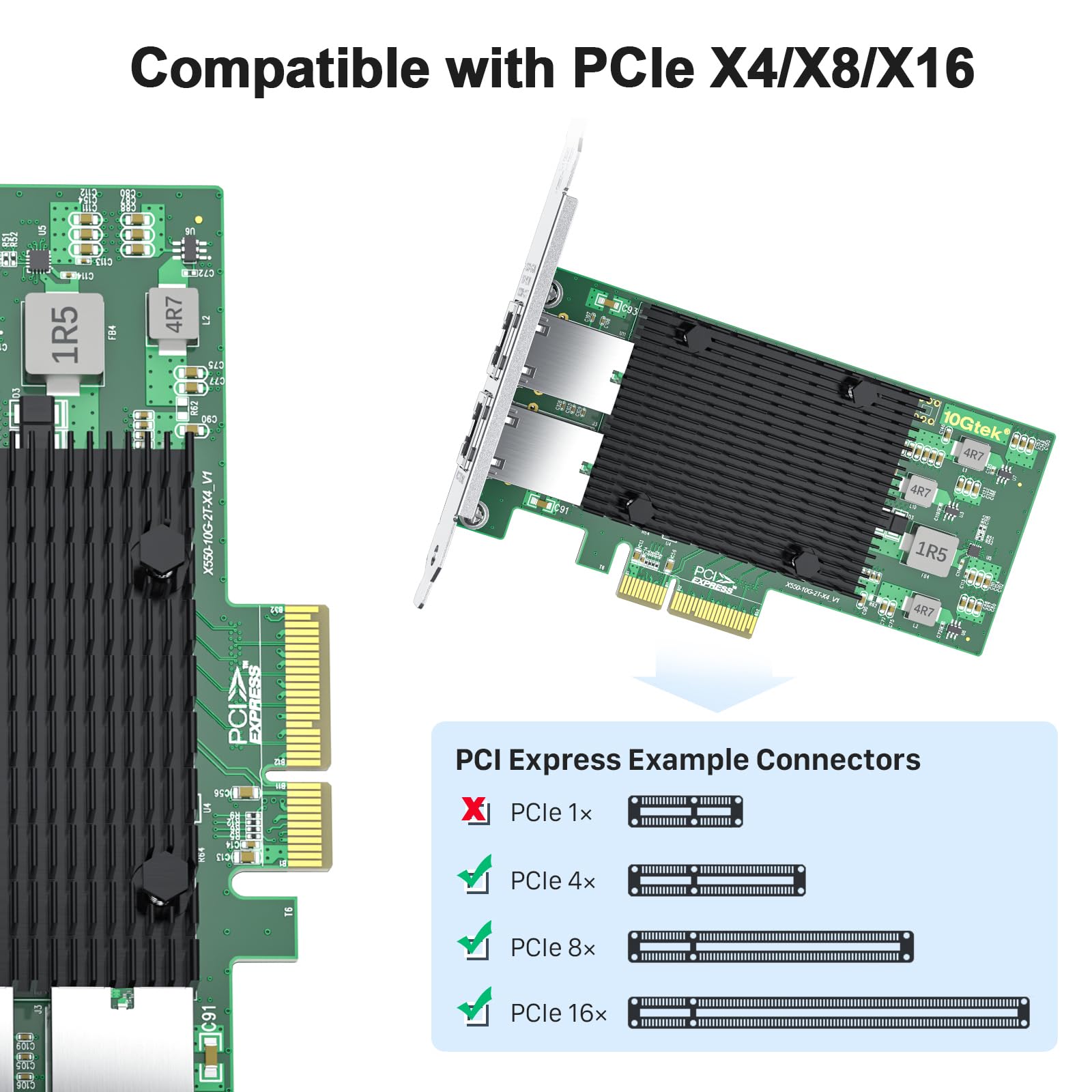 Supports 100M/1G/2.5G/5G/10G, (If the X550 NIC cannot negotiate to 2.5G/5G automatically, please try configuring it to 2.5G/5G manually). Dual copper RJ45 ports(100MbE/1GbE/10GbE) let you connect to network cable for meeting the demands of data center environments. PCIe v3.0 (8.0GT/s) (Compatible with 2.0 and 1.1), X4/X8/X16 Lane.