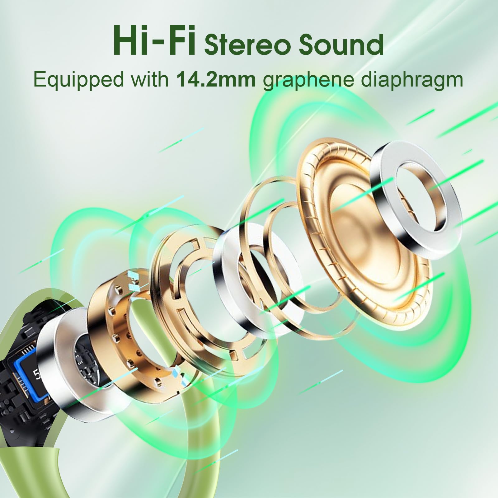 Hi-Fi Deep Bass Stereo and Crystal Clear Calls: Bluetooth earphones 14.2mm large size speaker driver delivers powerful bass, mellow midrange, and clear treble, reproducing your music vividly to power your workout. Noise cancelling headphones are equipped with high quality ENC noise reduction mics to passively cancel 80% background noise so you and the caller can hear each other better and make crystal-clear calls with minimal background noise. Enjoy top-notch conversations wherever you are.