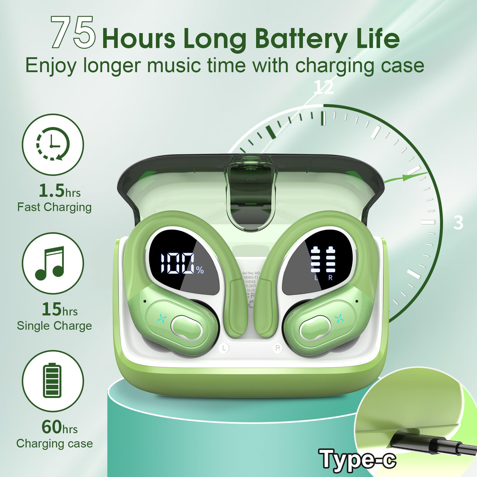 75 Hours Playtime and Dual LED Display: Running headphones provides up to 15 hours continuous using time on a single charge, portable charging case can charge the earbuds for 5-6 times, giving 75 hours of a total playtime. Whether on the road or in daily life, it will provide unparalleled convenience and smart experience. The dual LED display on earphones accurately display the remaining power of charging case and the charging progress of Wireless ear buds.