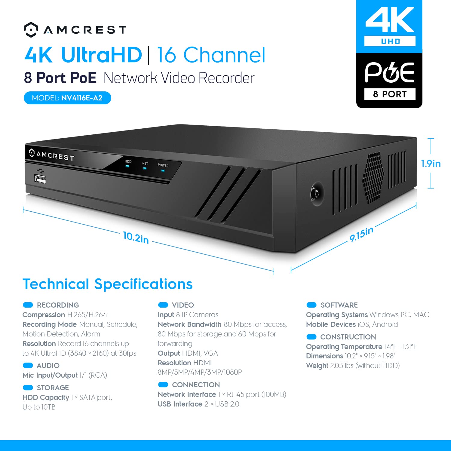 AMCREST MODEL: NV4116E-A2 NVR FEATURES: Extraordinary Quality: Supports 16-Channel 1080p/3MP/4MP/5MP/6MP/4K Resolution Records 16-Channels @ 1080p/3MP/4MP/5MP/6MP/8MP & Playback 8-Channel @1080p(30fps)/4-Channel @4MP(30fps)/2-Channel @4K(30fps) Record in Widescreen, Quick Access QR Code Remote Viewing on iOS, and Android (w/ included Amcrest View app) Advanced H.265 compression technology lets you save on storage space which allows for longer recording times. H.265 technology compresses your video without sacrificing any of the UltraHD video quality Max 80Mbps Incoming Bandwidth, records 7 cameras @ 4K using H.264. Records 8 cameras @ 4K by changing default settings from H.264 to H.265 and adjusting bit rate to 1792 on each camera for maximum optimization Remotely Access Using Standard Windows and Mac Browsers Feature-Rich OSD: Camera Name, Time, Motion Detection, Video Loss, Lock, and Record Status Icons Multiple Trigger/Alarm Events: Recording, PTZ, Tour, Video Push, Email, FTP, and Buzzer Custom Record Modes (e.g. Manual, Scheduled, Motion Detection) and Record Intervals (1-120min) Supports AI Features from AI IP Cameras, AI features available depend on the camera model being used. Only Supports 2CH AI Cameras at 4K@30fps. No built-in AI Features on NVR This product may contain components which are not NDAA compliant Supports up to 10TB Hard Drives (Hard Drive Not Included) PACKAGE INCLUDES: 1 x 4K 16CH (8 Port PoE) NVR (NV4116E-A2) 1 x USB Mouse 1 x Network Cable 1 x SATA Cable User Manual, Quick Start Guide This NVR requires a hard-wired connection directly to your router to operate. Supports all Amcrest WiFi and Wired IP cameras.