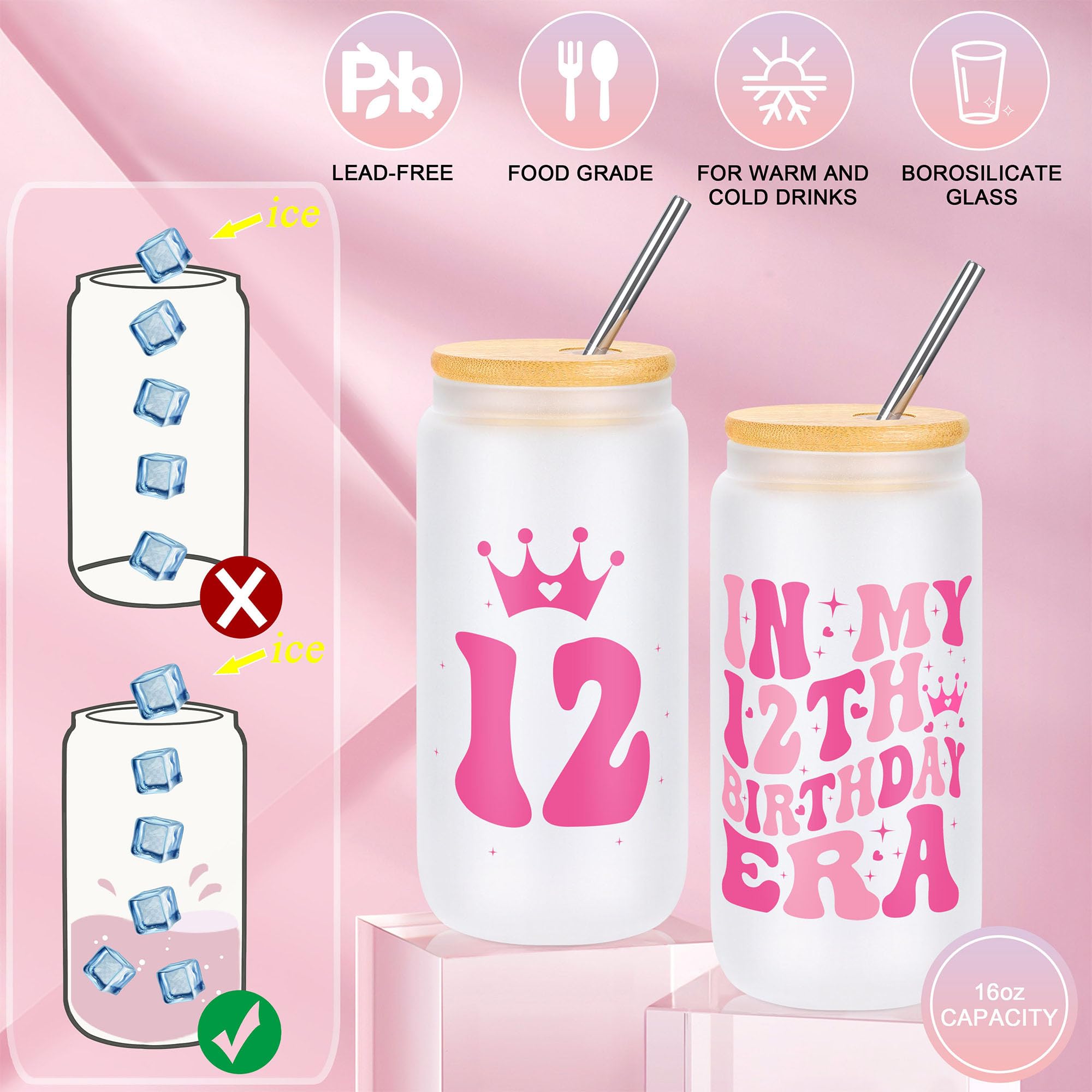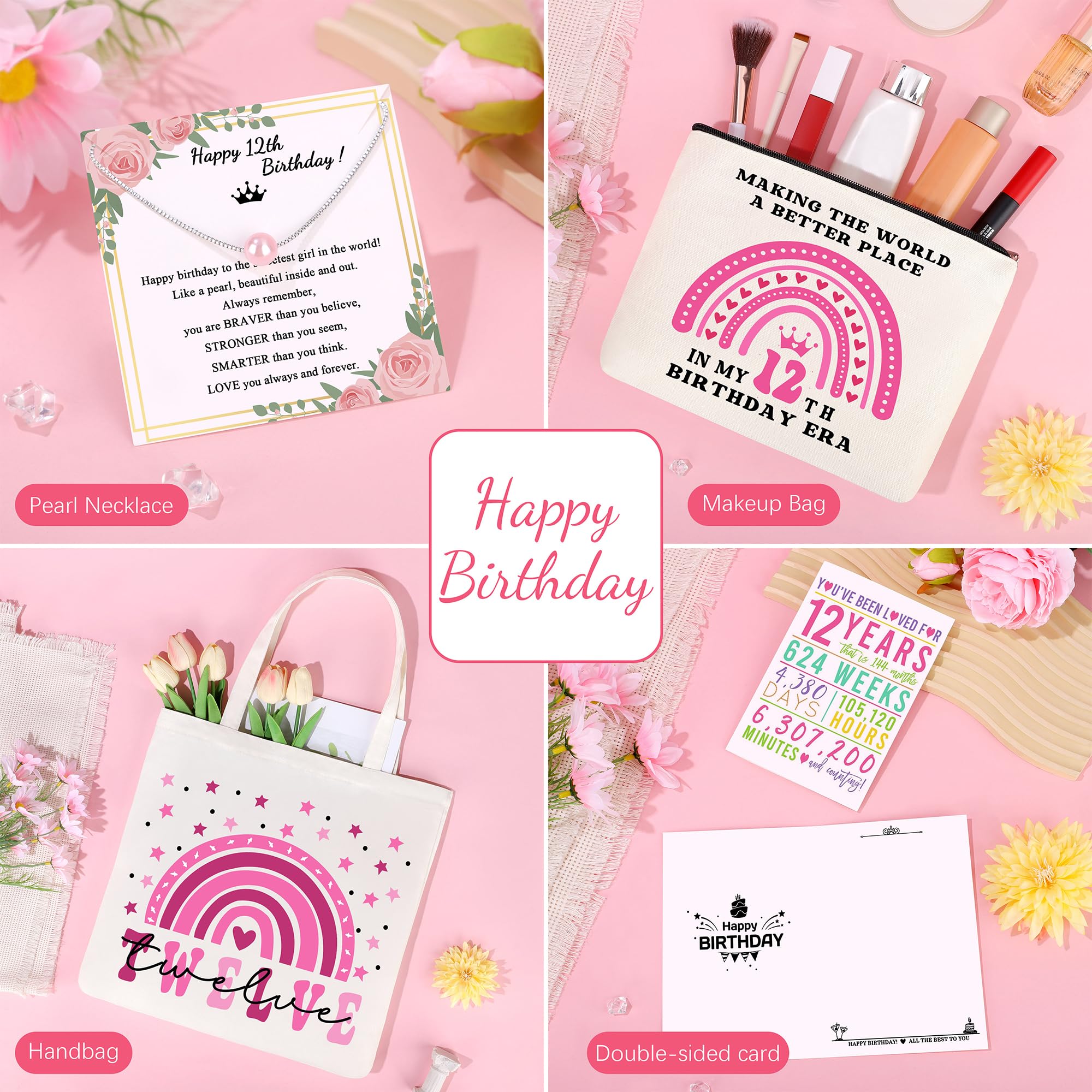đăGifts for 12 Year Old Beautiful Teen GirlăBirthday 6 piece set includes 1 x exquisite patterns, fashionable handbag, 1 x In my birthday era makeup bag, 1 x 16 Oz can glass with lid and straw, 1 x Socks made of pure cotton, unique design and cute style, 1 x heartfelt congratulations card on kraft paper and 1 x stylish pearl necklace with a souvenir card.