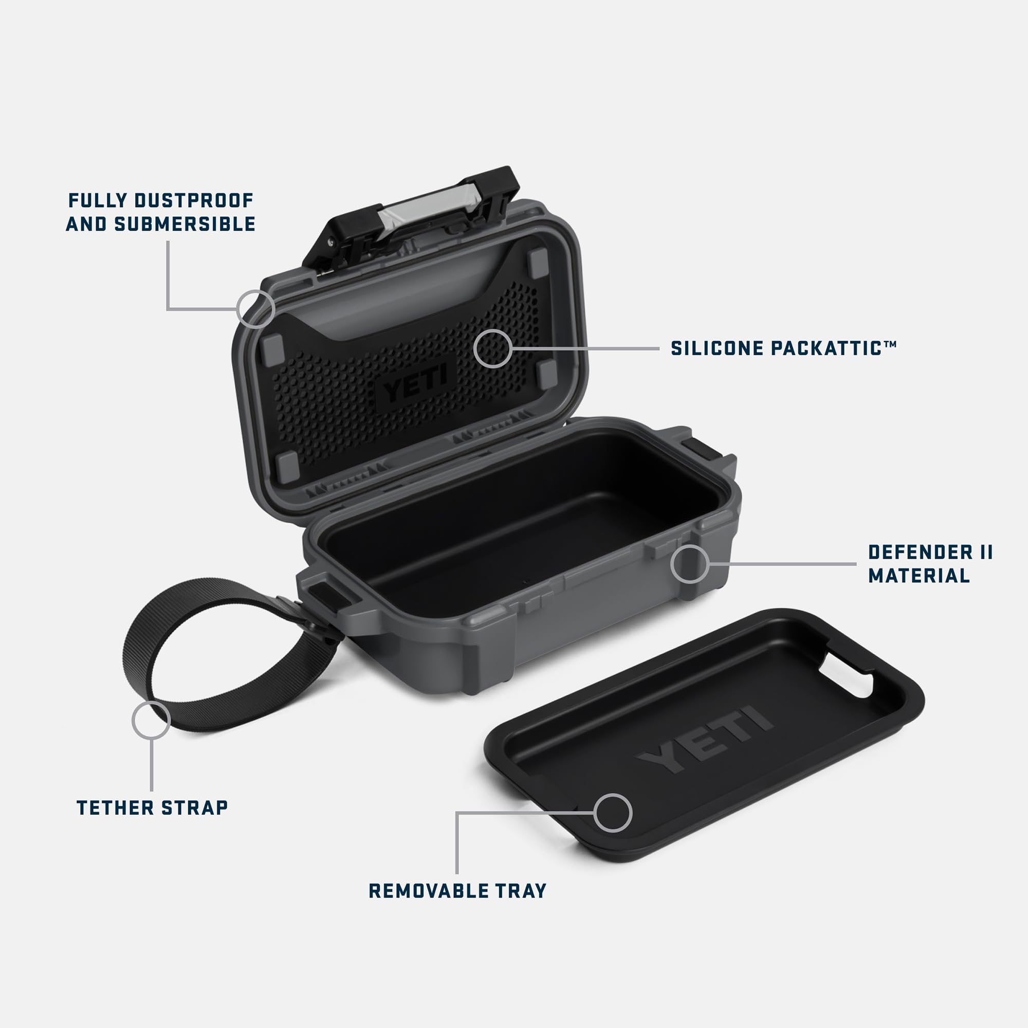 Meet the newest, most compact member of our nearly-indestructible Loadout GoBox family. Designed with a rigid and weather-resistant exterior, the Loadout GoBox 1 Gear Case houses the items you can’t leave home without. The removable tray and Silicone PackAttic accommodate most phones and keep slimmer gear, such as car keys, credit cards, park passes, and fishing licenses safely in stow and easy to access. The ultra-durable tether strap easily loops and locks around the equipment you need it to, think saddles, skiff grab rails, or side ATV doors, and keeps the essentials on hand when you don’t have one to spare. Waterproof, dustproof, and virtually unbreakable, the GoBox 1 is made with the same quality you’ve come to expect in an all-new, portable size