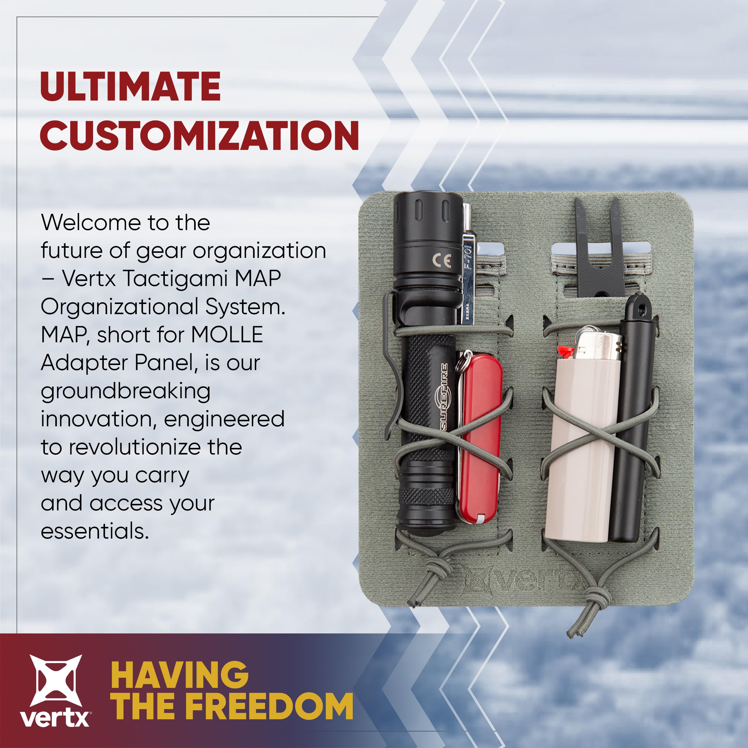 Welcome to the future of gear organization – Vertx Tactigami MAP Organizational System. MAP, short for MOLLE Adapter Panel, is our groundbreaking innovation, engineered to revolutionize the way you carry and access your essentials. Imagine having the freedom to tailor your gear setup exactly as you want it. With our patent-pending compatible Molle panel, that vision becomes a reality. This compatible Molle patch panel is precision-cut to harmonize seamlessly with a wide array of Molle accessories. Attach it in any direction you choose, and experience the limitless customization possibilities. Enhance the capabilities of your Vertx bags and packs by integrating the MAP system. Ideal tactical backpack attachments and tactical bag attachments. Whether you're a tactical enthusiast, an outdoor adventurer, or simply need an everyday carry solution, our MAP Admin compatible molle accessories for backpacks ensures your gear is always within reach and brilliantly organized.
