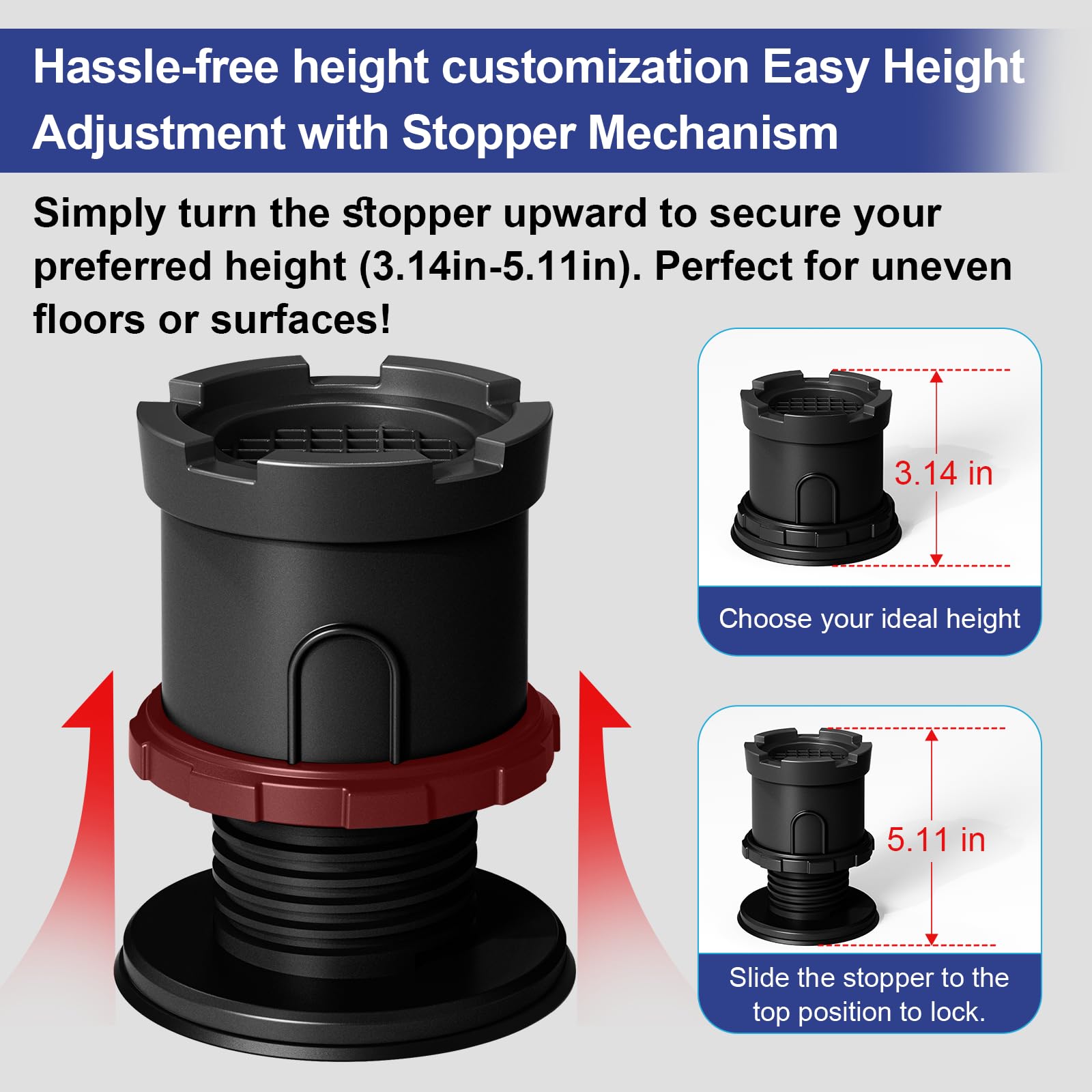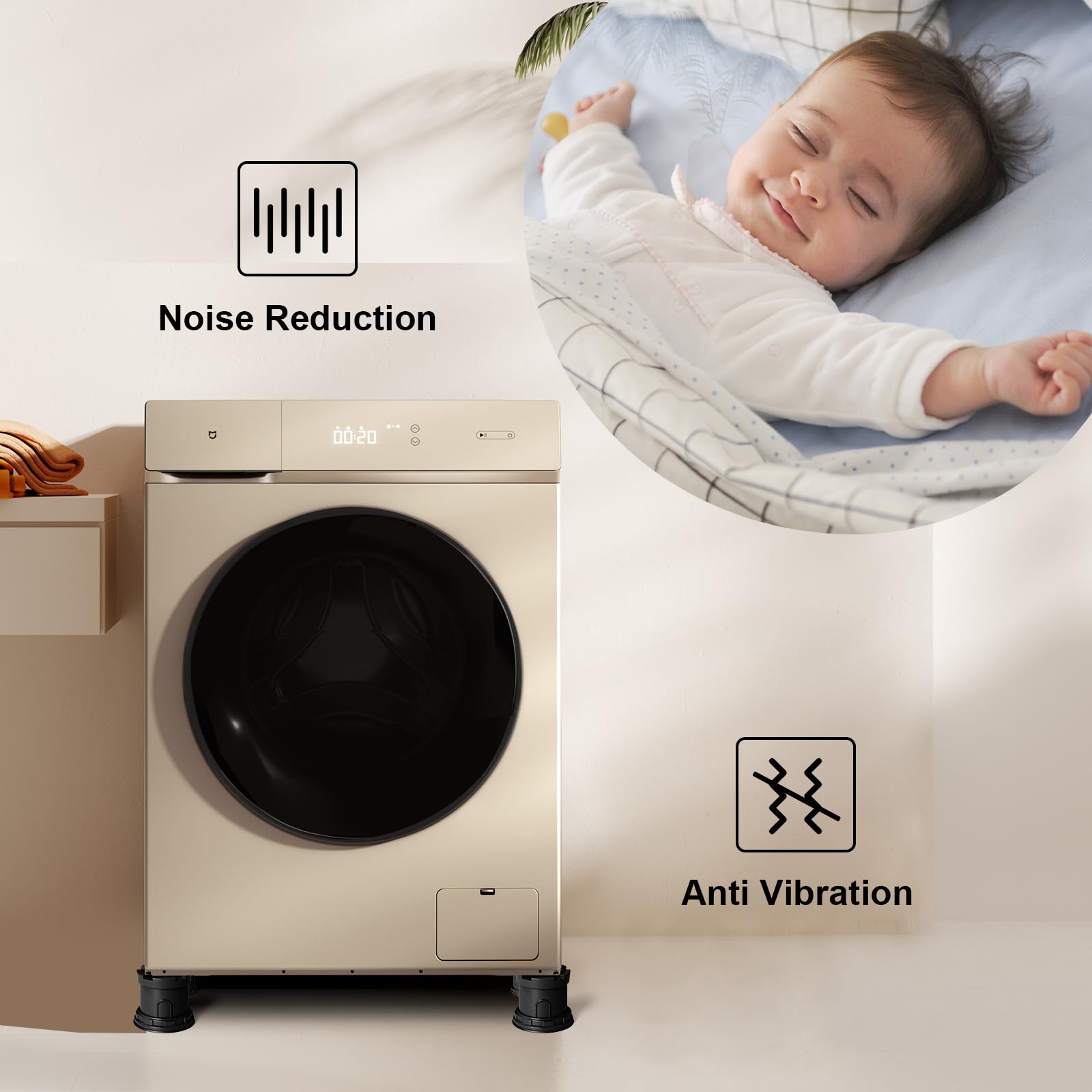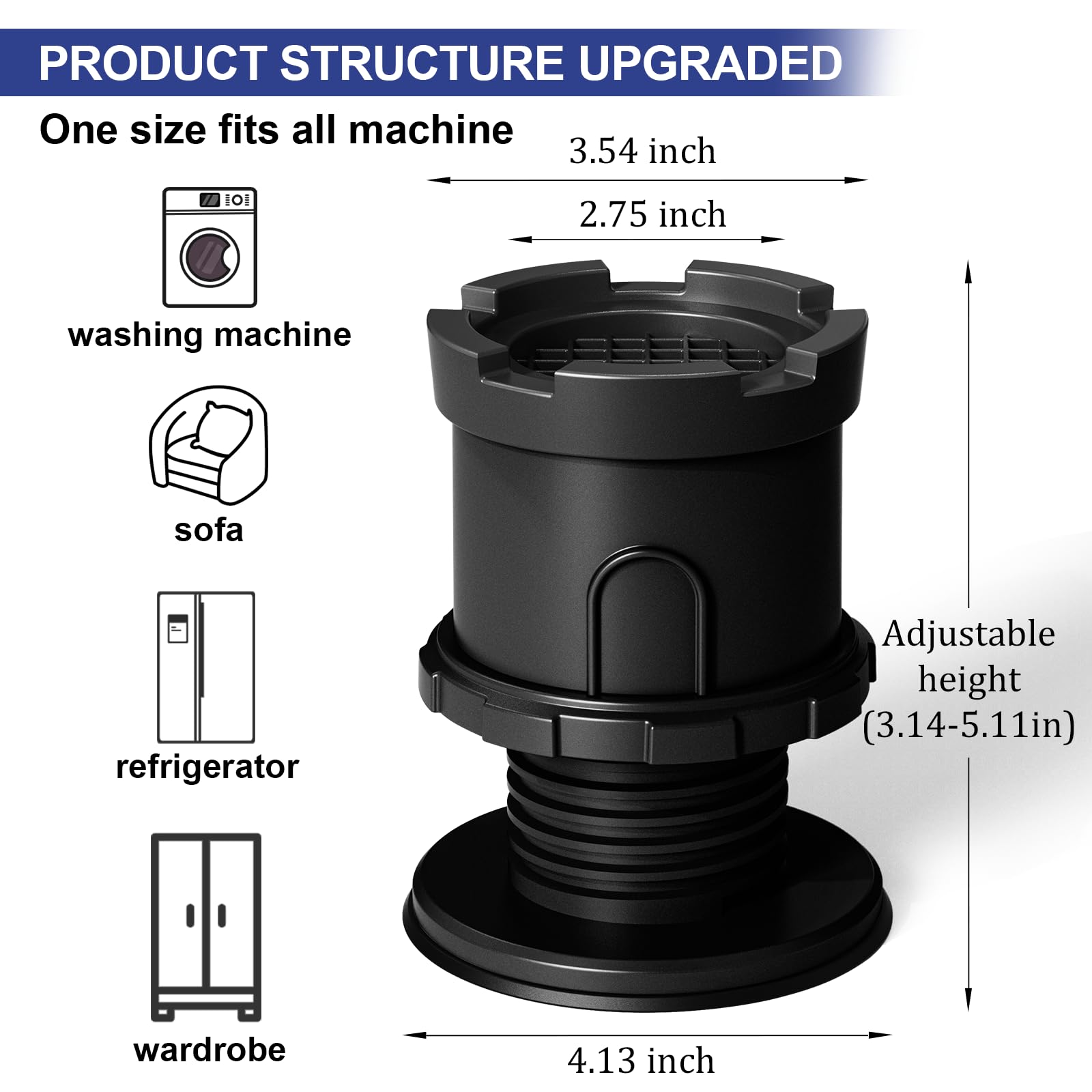 Adjustable Height: CUISIBOT anti vibration pads for washing machine with height adjustable design lifts the washing machine about 3.14-5.11 inches, allowing you to customize the height you want. Absorbs vibration, noise and stops shaking at the same time. Solves the problem of difficult draining and cleaning.