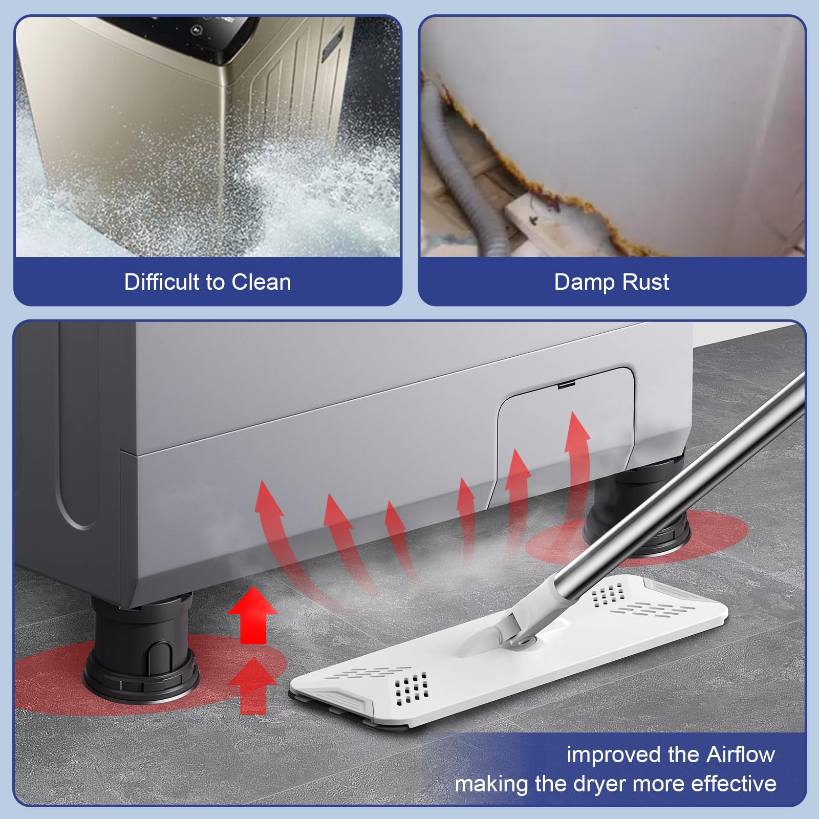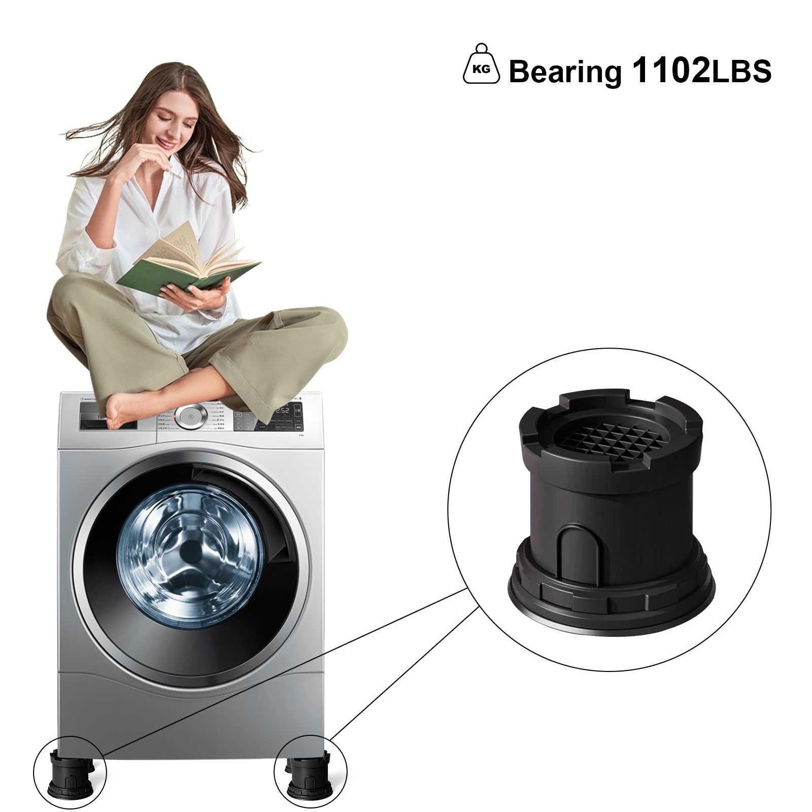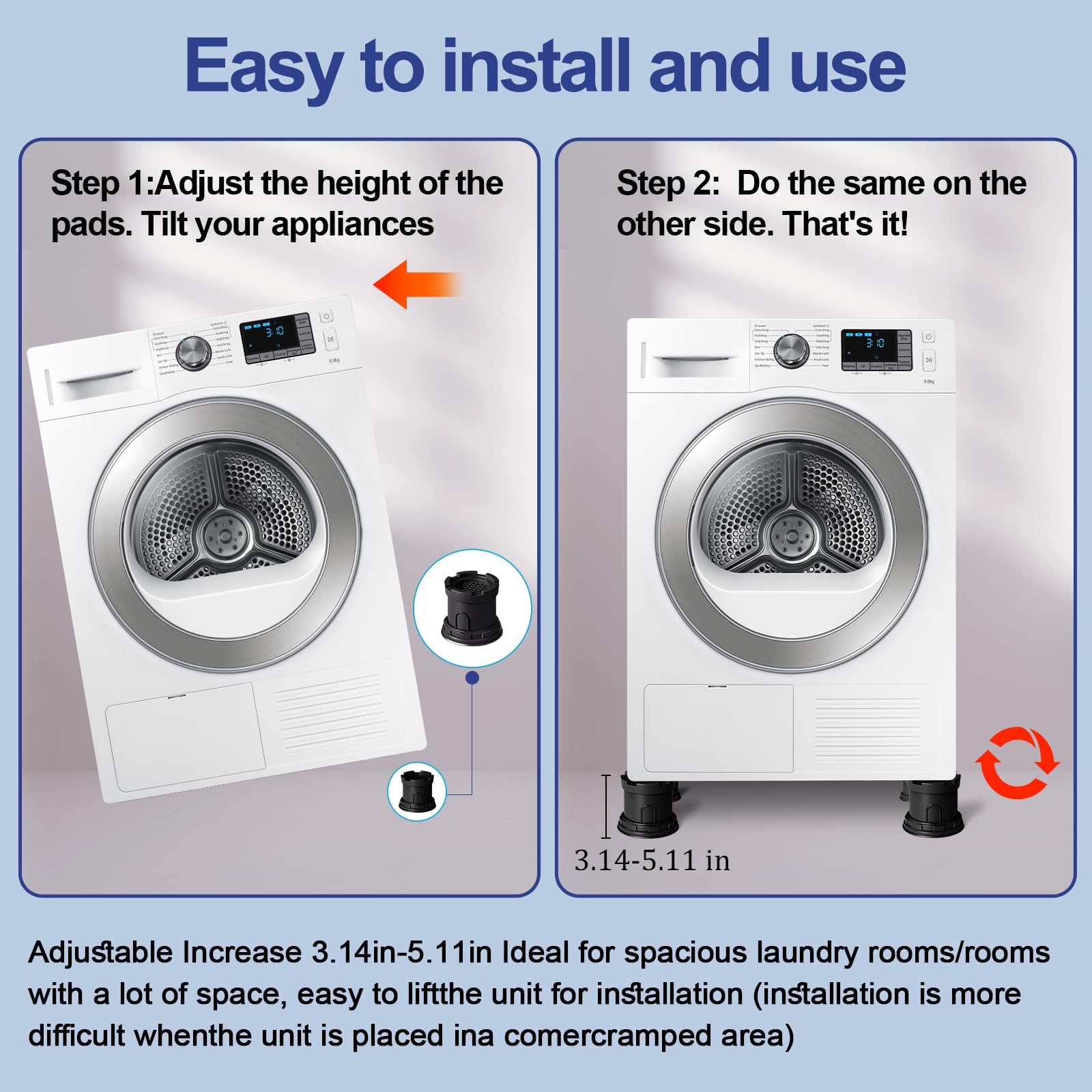 Wide Application: Shock and noise-canceling washing machine support anti-vibration pads can be used not only for washing machines and dryer but also for household appliances, beds, sofas, table legs, chair legs, closet legs, sofa legs, ncrease the height of the appliance and furniture to prevent moisture and make cleaning easier.