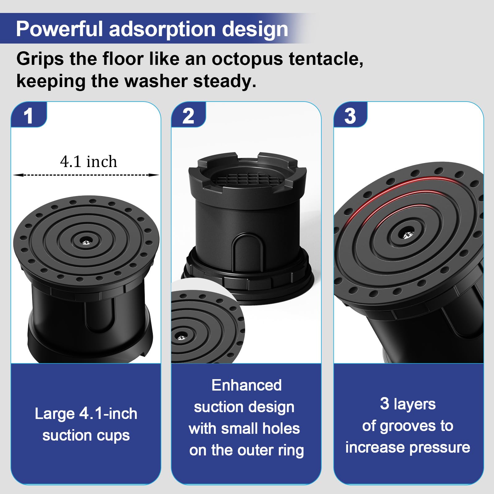 High Quality: The washer and dryer pedestals is made of high quality PP and TPU, the washer feet have a large 4.1 inch suction cup bottom that prevents vibrating washers from walking, slipping and moving and reduces noisy vibrations from dryers and other rotating machines. It not only protects the machine, but also protects the floor.
