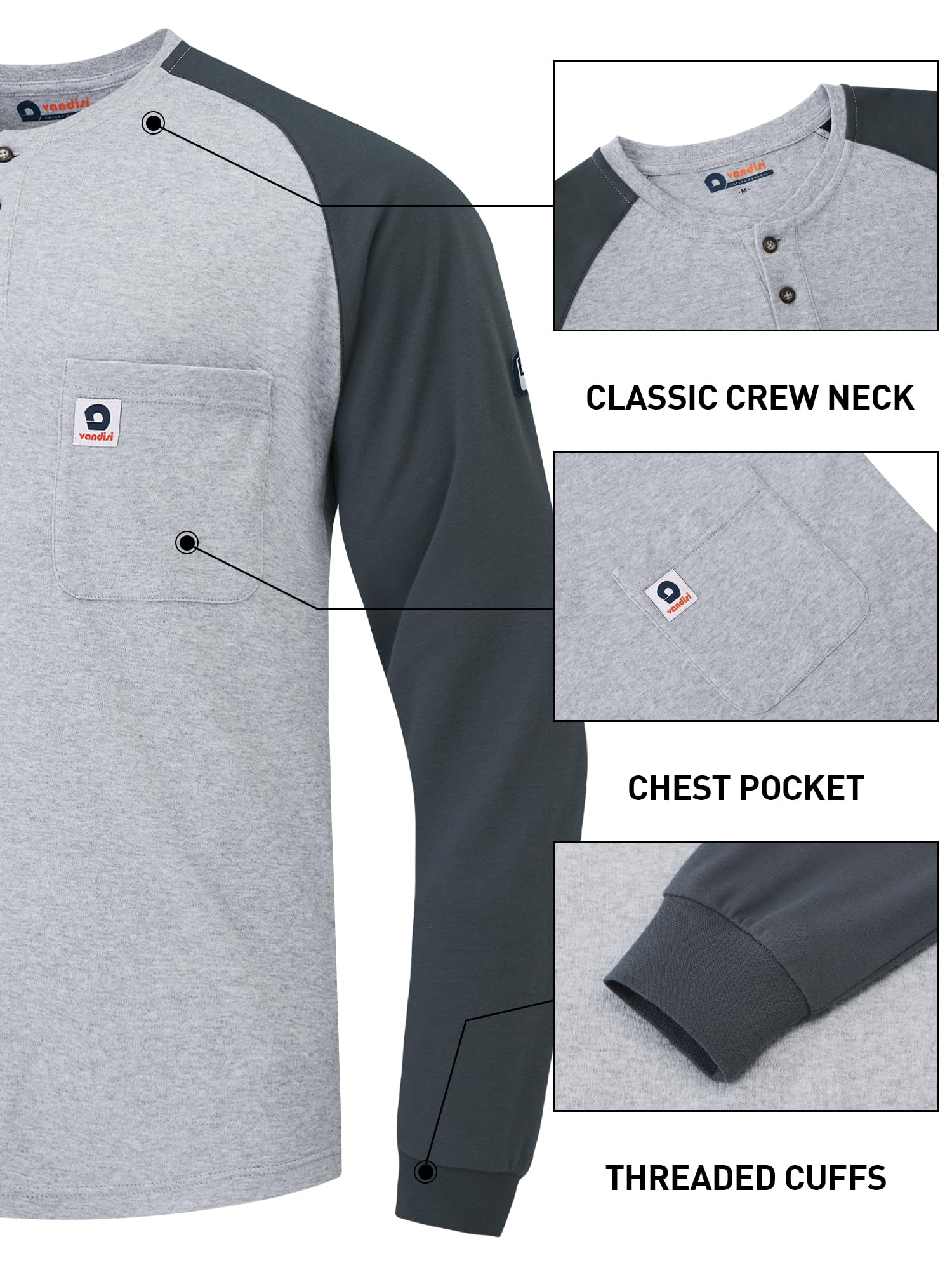 【Humanized Design】The Vandisi CAT 2 FR shirt features high-density seams and thermal transfer labels neckline for a true comfort experience. Henry collar and rib knit cuffs, enhanced fabric durability and stretch provide ease of movement and longer-lasting wear. Raglan sleeves significantly improve the fit of the shirt, 1 left chest pocket and 1 sleeve pocket for great convenience!