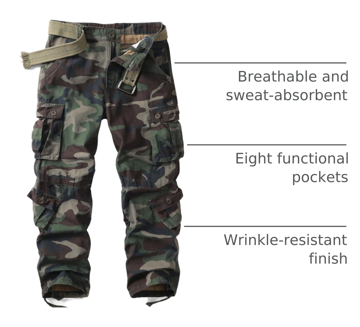 Product Material: Solid and camo cargo pants for men use 100% cotton fabric, treated for ease of care with a wrinkle-resistant finish and durability,it features non-slip, durable, comfortable, abrasion-resistant soft,breathable and sweat-absorbent,can repel the stains, liquids and soil keep you all day dry and clean.Relaxed fit military pants with zipper closure and straight leg,drawstring tie inside the ankle and the waist for comfort fit.