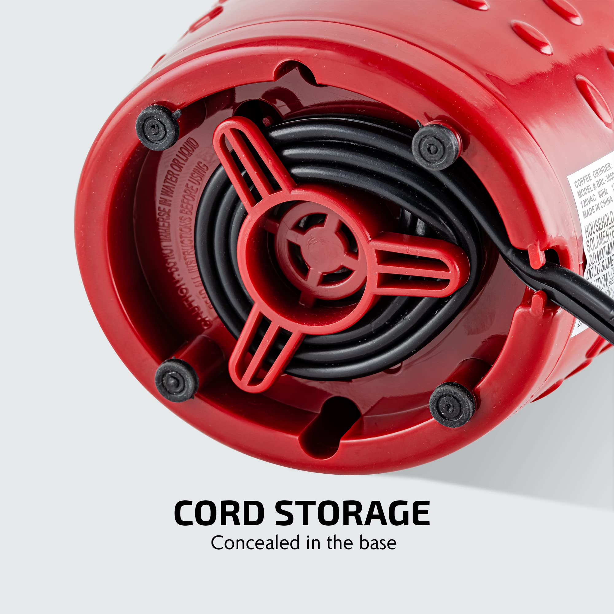 EASY TO CLEAN – The grinder's durable stainless steel interior makes it incredibly easy to clean. Designed for effortless filling and pouring, the bowl is convenient to use and easy to maintain - just wipe it clean with a cloth. Plus, the built-in cord storage at the bottom neatly tucks the cord away when not in use, offering compact storage and keeping your countertop tidy.