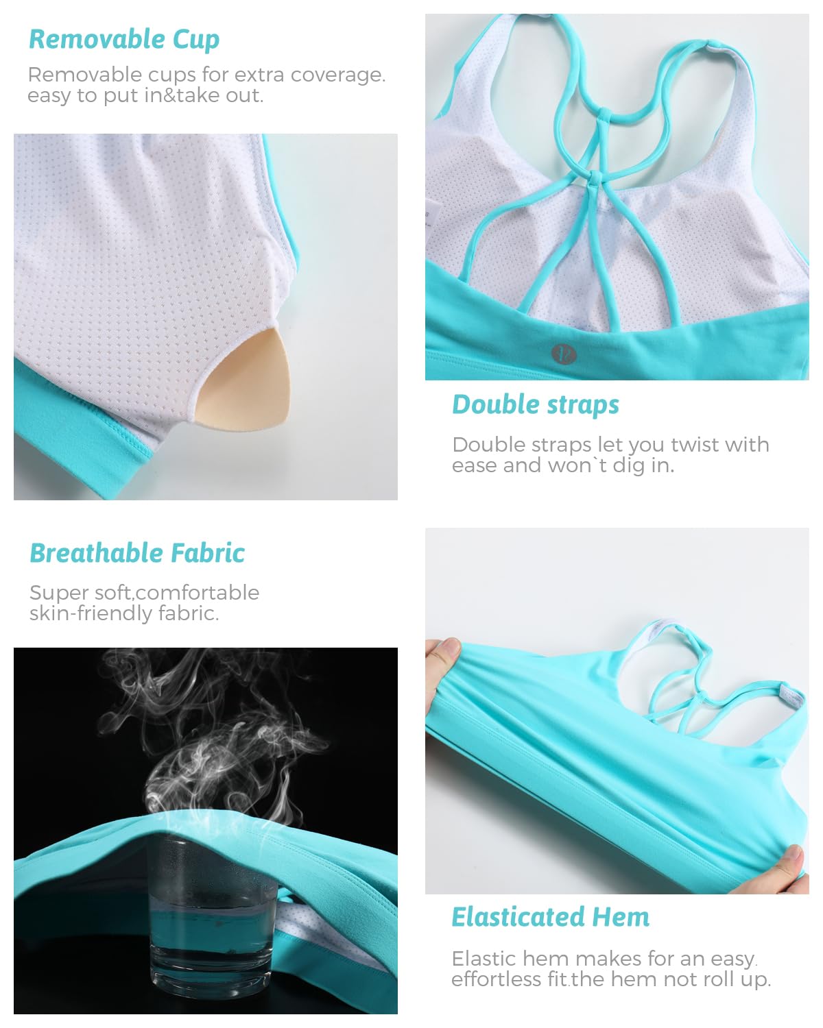 √YOUR SECURE FIT - Strappy design meets sporty style. Super soft scoop neckline with light, removable pads. Open cutout back styling sports bras for women medium support, widen band underneath the breast ensures a tight secure fit. Removable cups for extra coverage. The removable vertical cotton bra pads are easy to clean.The padded sports bra which always retains its shape and prevent bra bulges, caresses your figure to adjust to your curves.