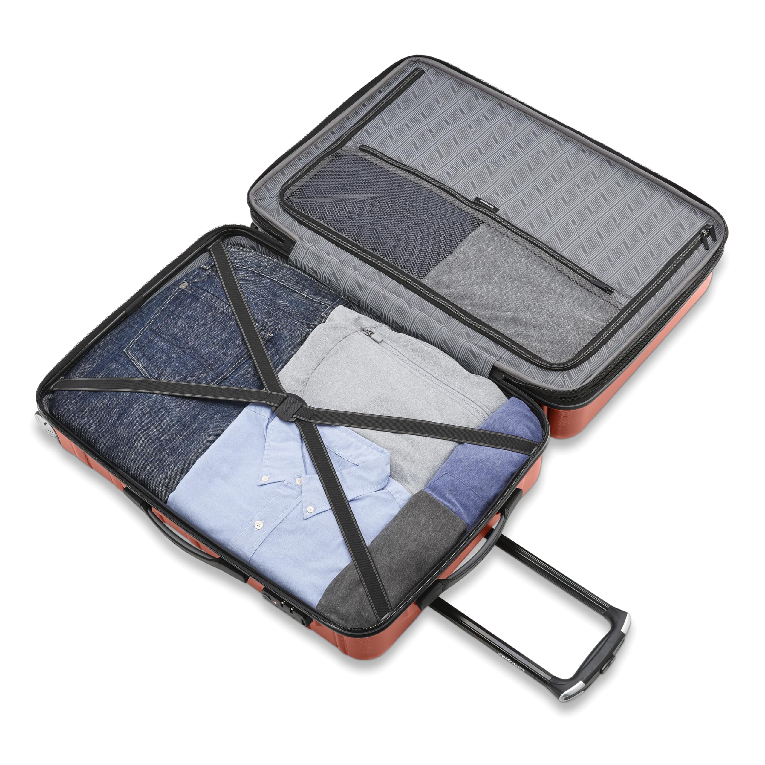 Description The Samsonite Omni 2 Luggage is a meticulously engineered suitcase designed to optimize the modern traveler's journey. Crafted with precision, this luggage with wheels epitomizes sophistication and functionality, catering to those seeking effortless travel experiences. A 28-inch spacious interior makes it convenient and practical for packing. With exterior dimensions of 30.4 x 20.9 x 12.4 inches including the wheels, this luggage is airline-approved to check and ensure ample packing room for that extended trip. Our hard case suitcase with spinner wheels facilitates fluid movement through bustling concourses and urban environments thanks to four multi-directional oversized dual-spinner wheels. The re-engineered lightweight construction further enhances effortless mobility. With durability in mind, the scratch-resistant polycarb brushed-texture shell serves as a shield against the rigors of traveling with a rolling suitcase, preserving its pristine appearance journey after journey. Backed by a 10-year limited warranty, it exemplifies longevity and reliability. Within its polished exterior lies a meticulously organized interior. Elastic tie-down straps, a lining pocket for small items, and a zipped mesh divider to arrange your belongings, you'll find efficiency and accessibility with this spacious luggage. Catering to the needs of the modern nomad, our luggage integrates a built-in charging system. Compatible with various battery types, it facilitates uninterrupted connectivity, empowering travelers to remain engaged and productive. Elevate your travel experience with the Omni 2 Luggage by Samsonite—a synergy of form and function. Embrace the epitome of sophistication and efficiency, and embark on a journey where every detail is meticulously curated for your utmost convenience and satisfaction.