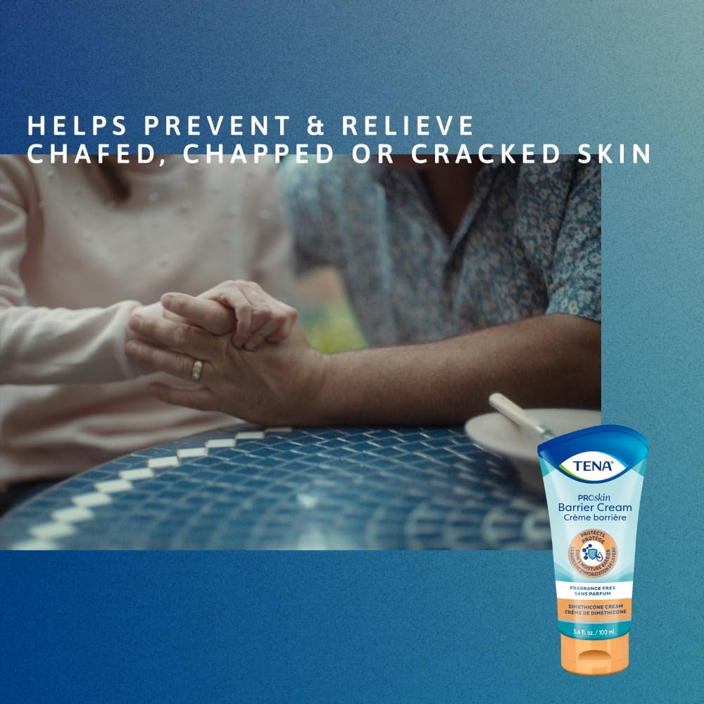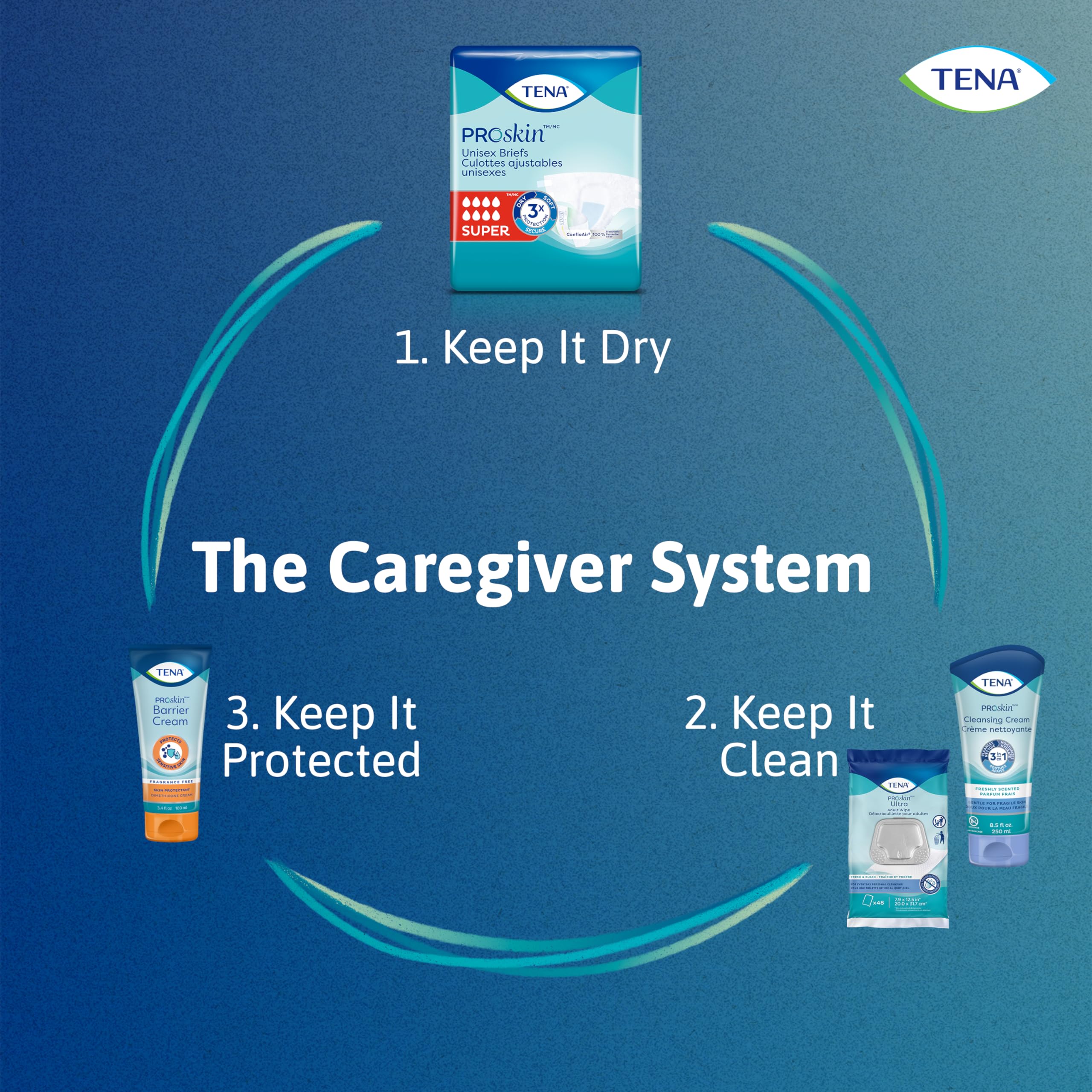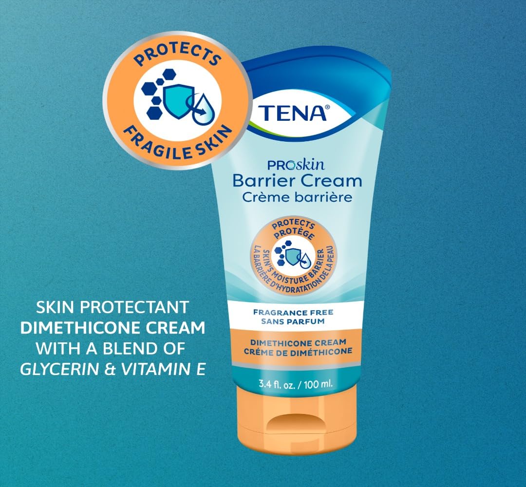 Tena ProSkin Barrier Cream is part of the Caregiver System of products that help manage your loved one's incontinence and skin health. These products work together to keep skin dry, keep skin clean and keep skin protected. The Tena ProSkin Barrier Cream works to create a layer on your loved one's fragile skin that protects it moisture that could lead to skin irritation. Formulated for easy application that doesn't stress fragile skin and easy of visualizing skin health. Contains dimethicone and a blend of natural oils (acacia, sunflower, jojoba and beeswax) that easily absorbs into the skin.