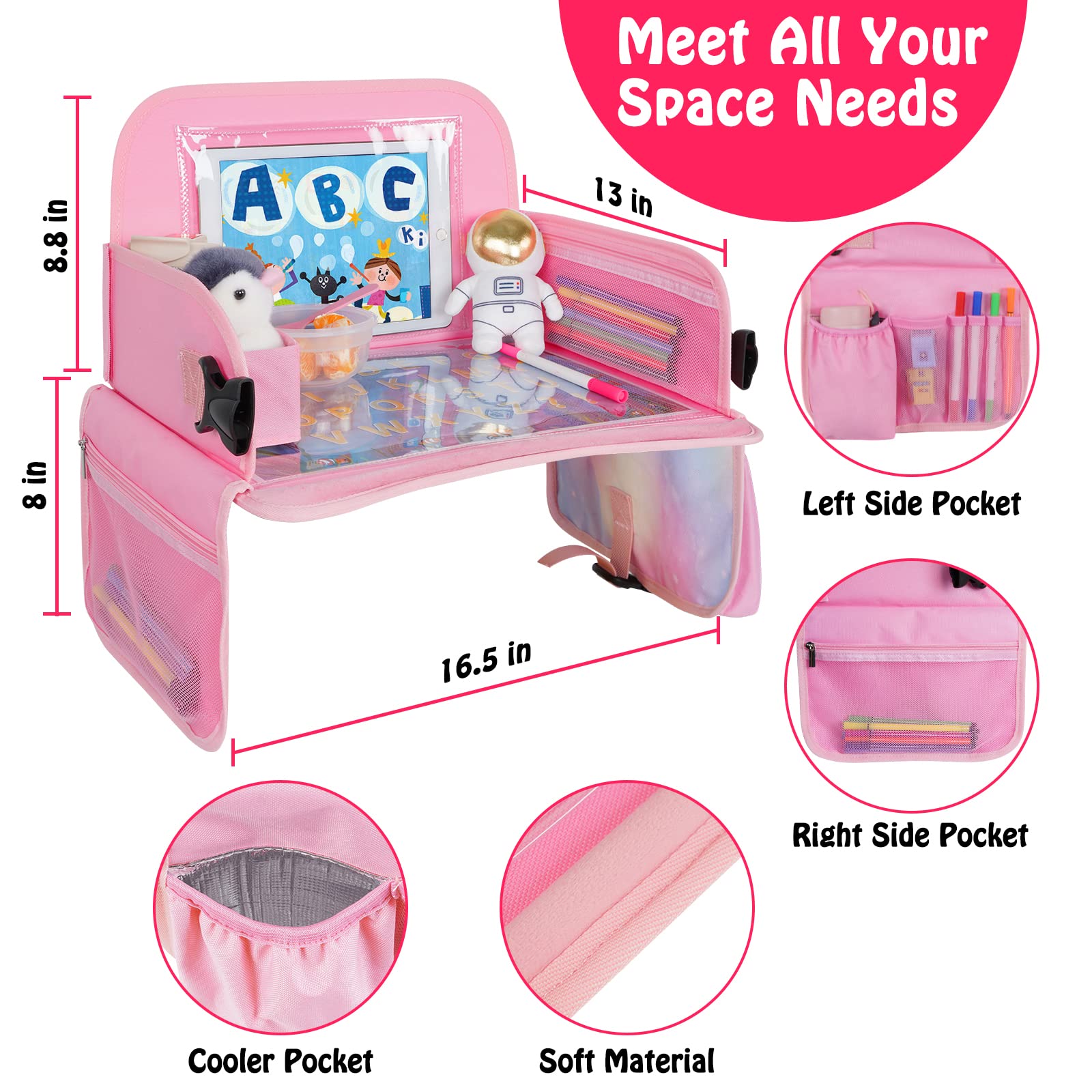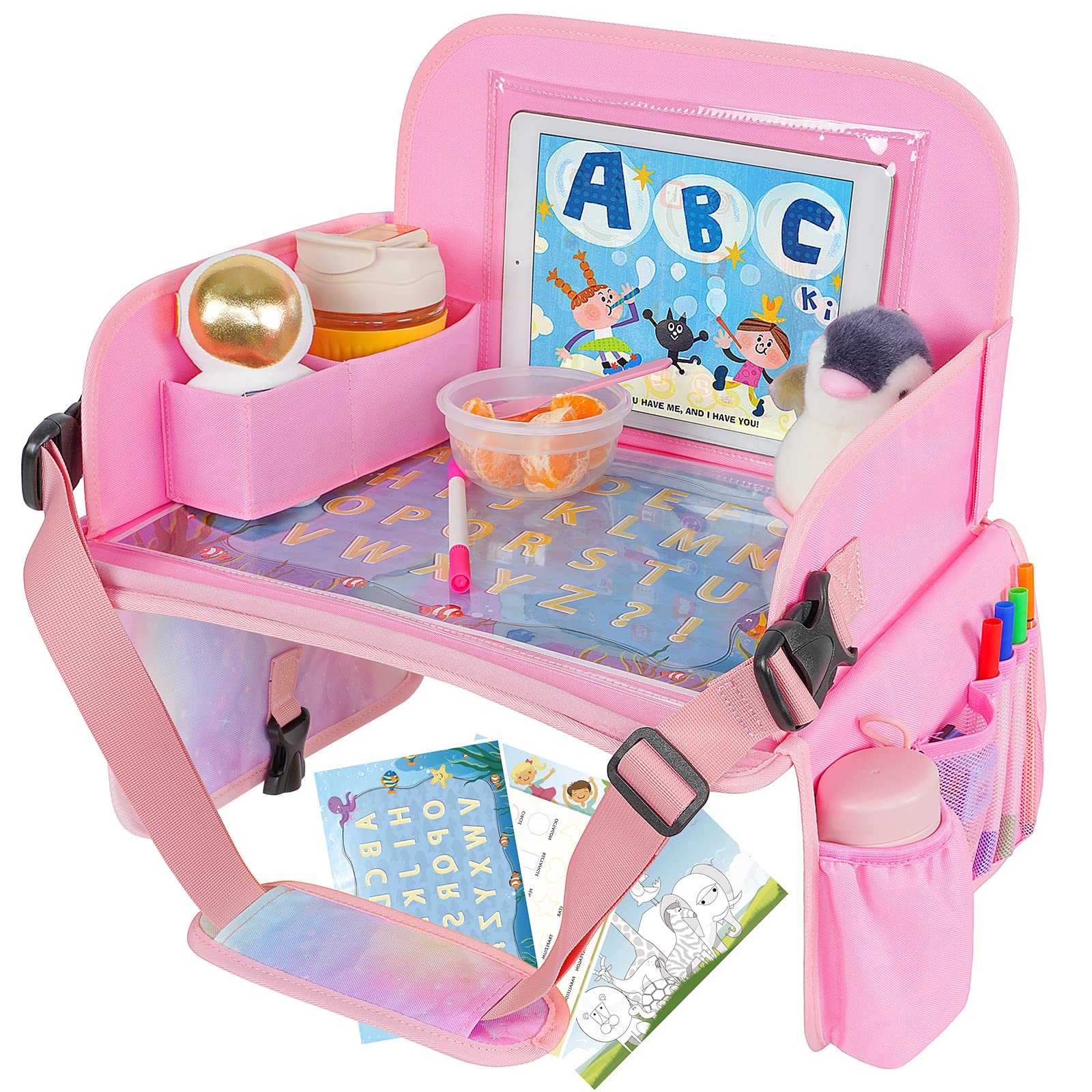 Dry Erase Board With Bonus: 16.5" x 13" large carseat tray comes with 3 educational drawing papers with animal, letters & graphics, which not only provides children with space to draw and learn, but also can be used as a snack car seat tray, and parents can easily clean it by simply using a wet towel. Children will love the dry erase feature on the tray portion