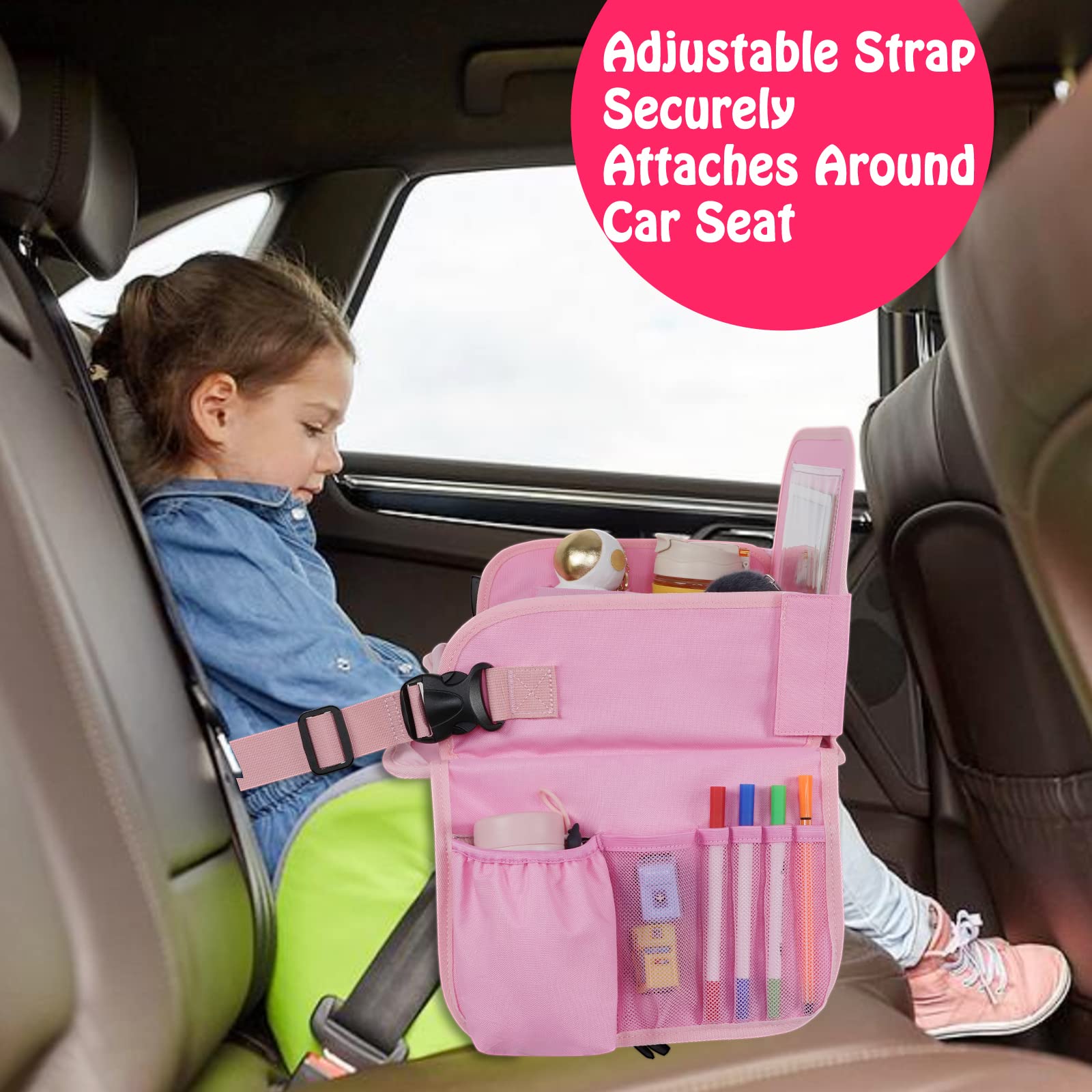 Portable For Traveling: The detachable adjustable strap and large travel tray for kids car seat make it safe and stable to place on the child's lap. The removable strap can not only surround the car seat to stabilize the table, but also serve as a shoulder strap for easy carrying