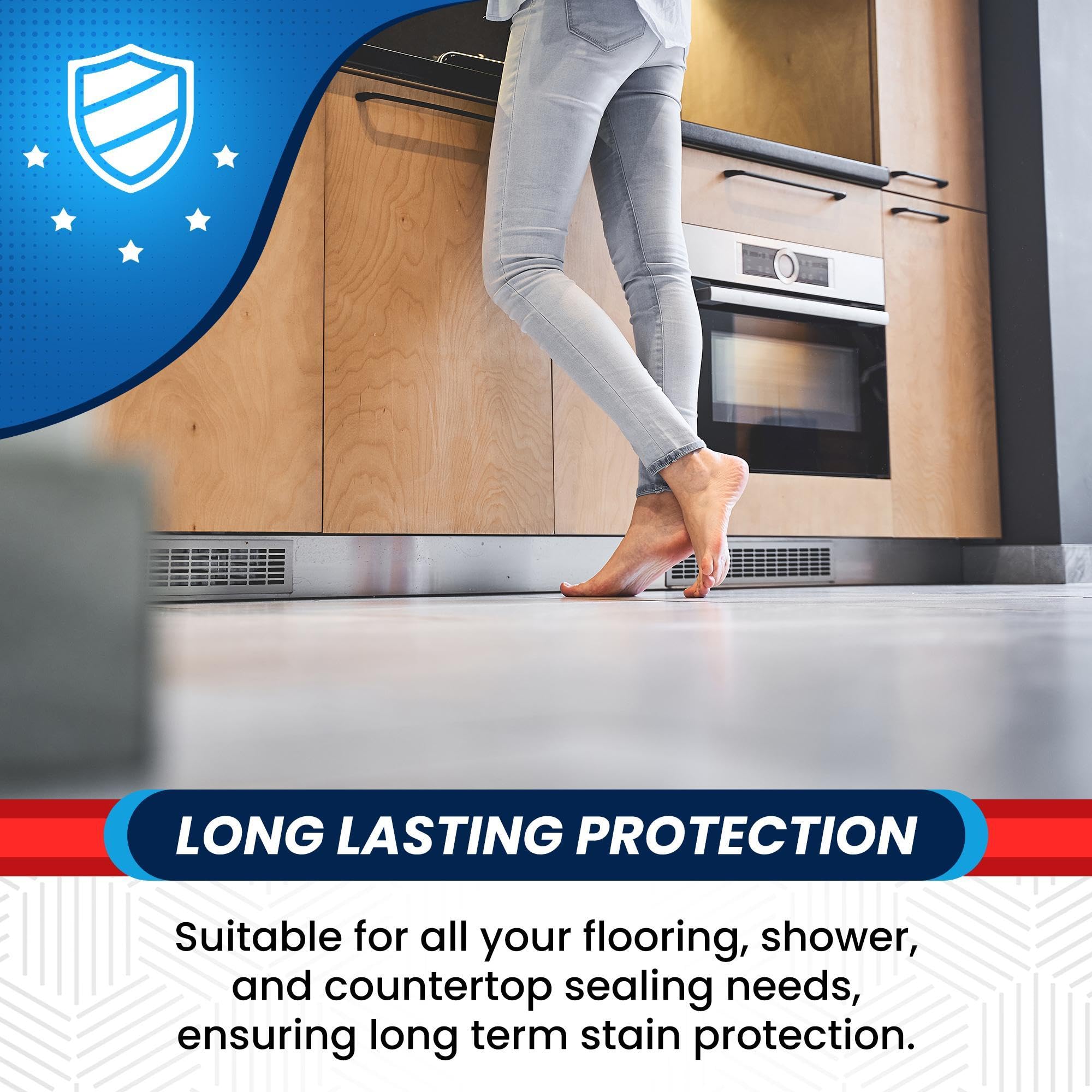 WATER & OIL DEFENSE: Formulated to create a strong barrier against water and oil-based stains. Keep your floors, showers, and surfaces looking clean and fresh.