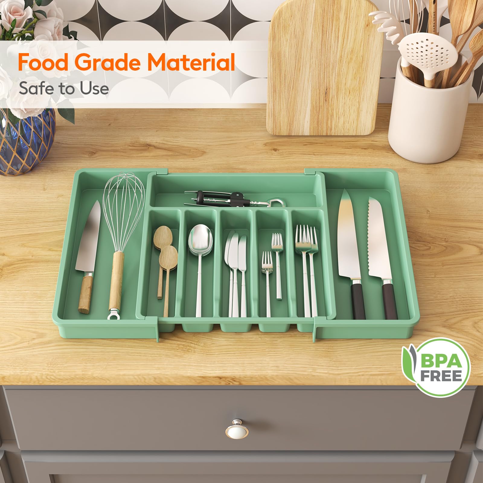 Robust and Safe: This kitchen drawer organizer is crafted from premium PP material, BPA-free and built to last. It ensures your silverware is stored in a healthy, safe environment for worry-free use