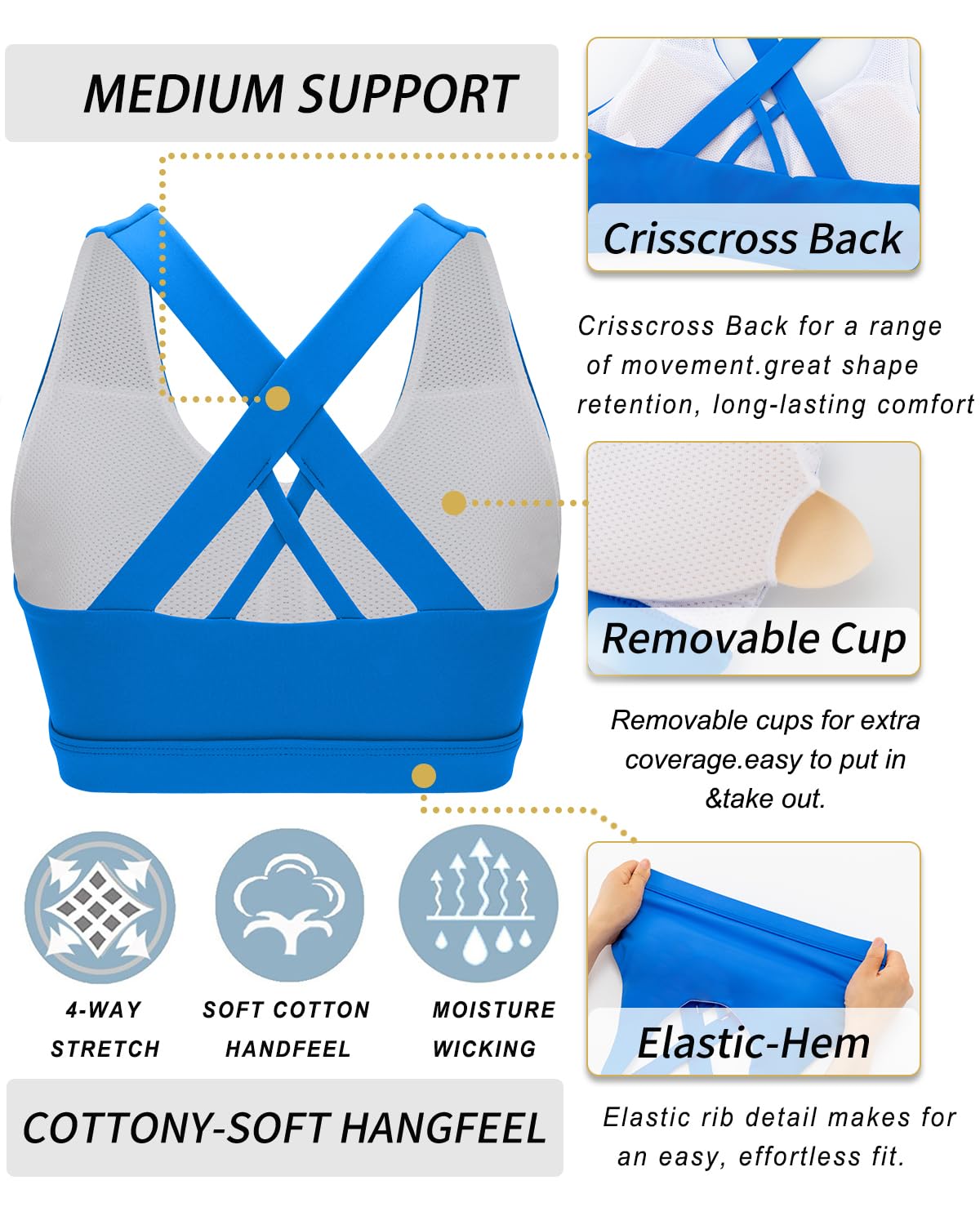 WHAT CAN WE OFFER YOU : Moisture-wicking Technology Metial Which Mean that You Can Enjoy Keeping Your Body Cool & Dry. Super Soft Elastic Band for Comfort & Movement Which Will Allow You Can Enjoy Sinking into Your Practice without Sacrificing Comfort. Built for Mid-Impact Support so You Will Get Staying Fit & Focused .We Wear-tested by Our In-house Team for the Perfect Fit , Goodbye Old Bra !!