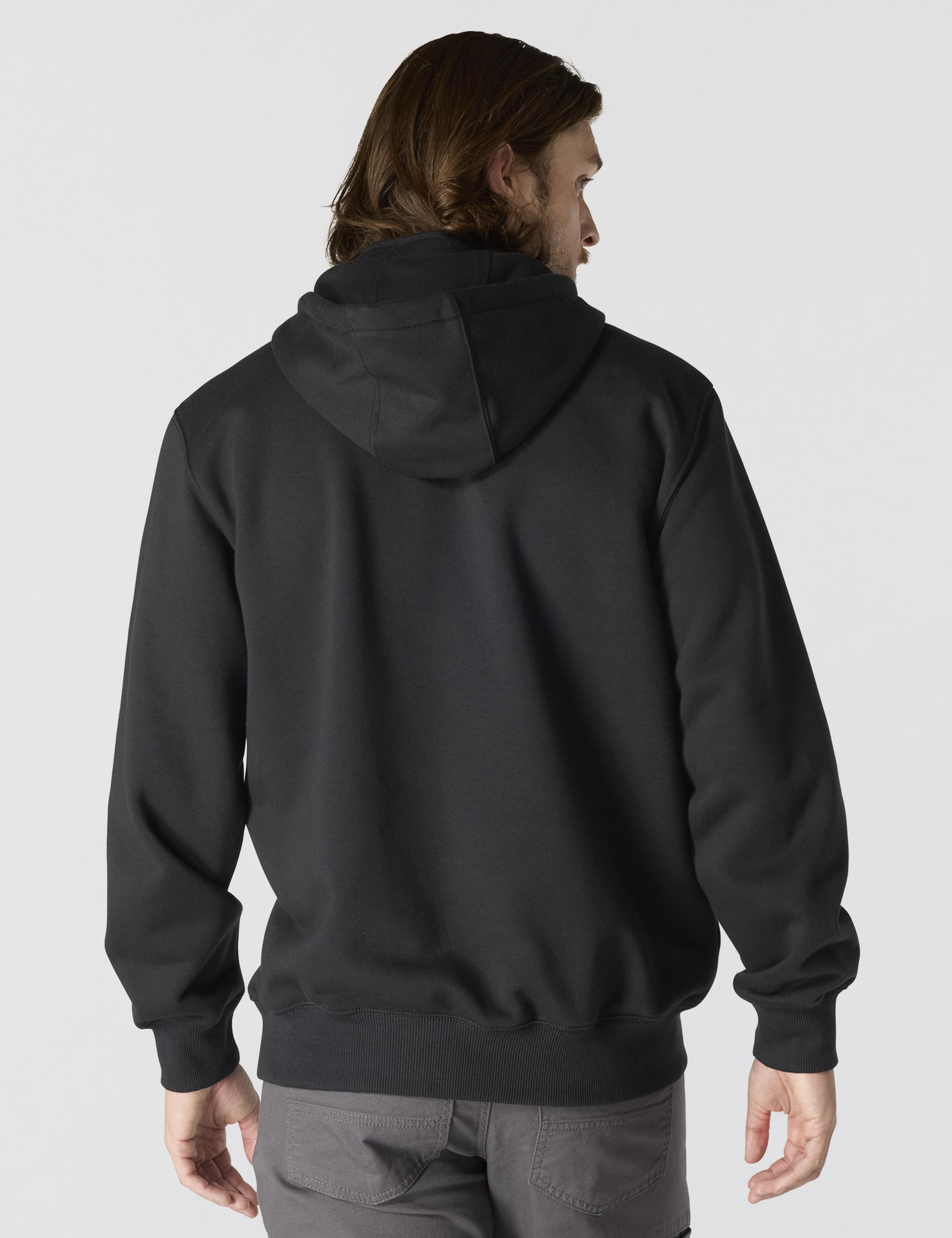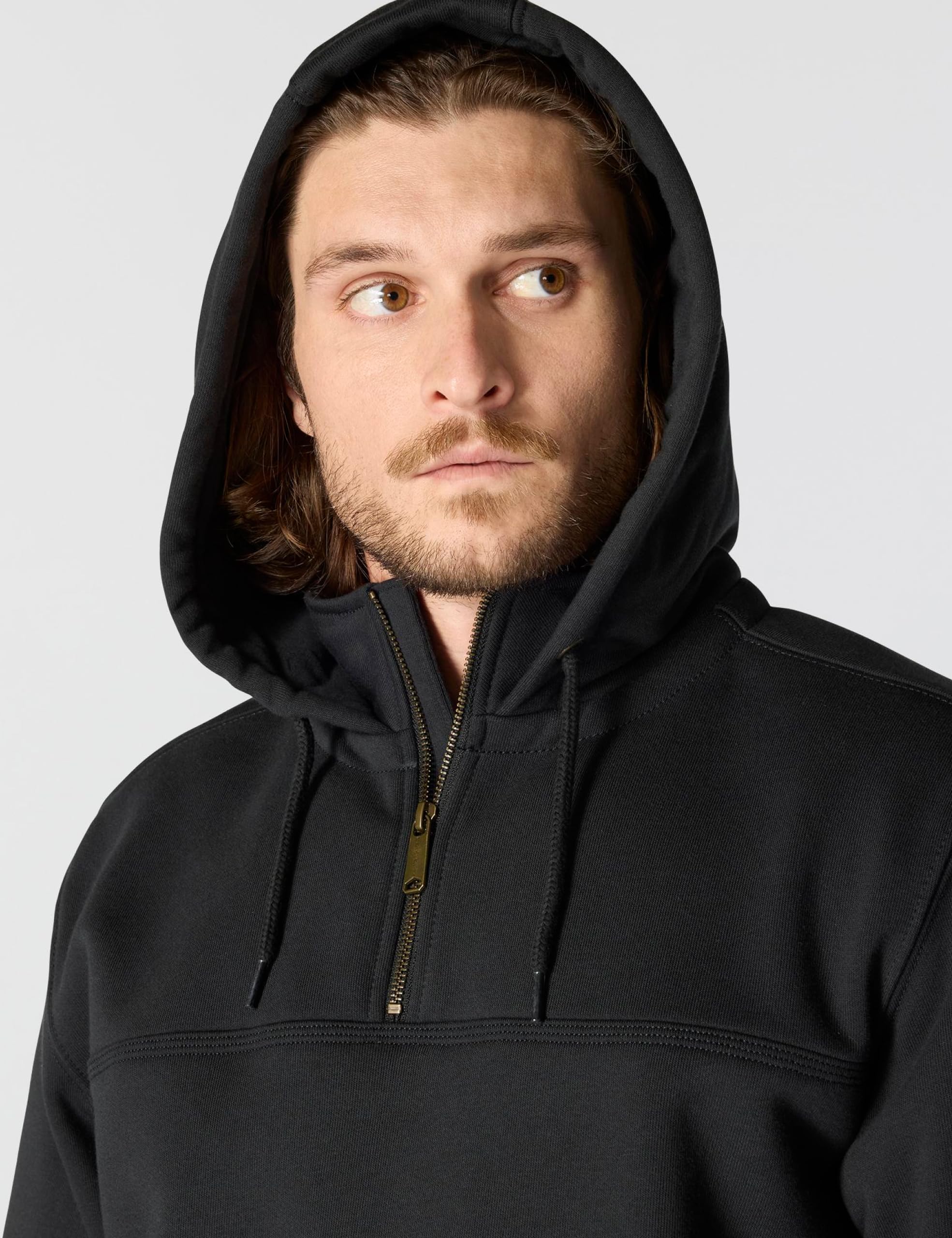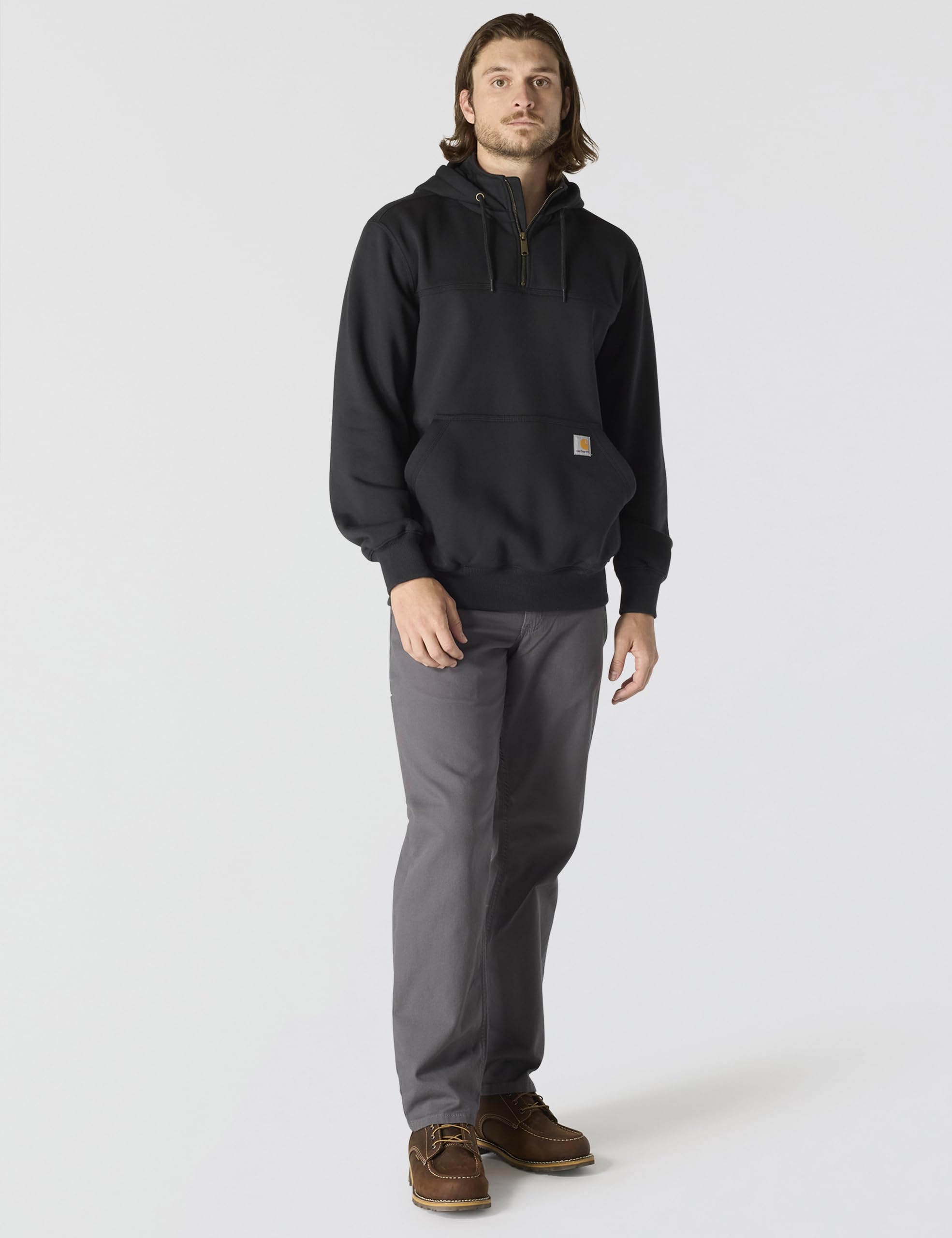 Description The heavyweight champion of sweatshirts is made of 13-ounce, 75% cotton/25% polyester fabric and has a Rain Defender durable water-repellent finish. The zip-mock collar has an 8-inch antique-finish brass zipper. It is designed with spandex-reinforced rib-knit cuffs and waistband to keep the cold out. There's an attached three-piece jersey-lined hood with draw cord and front hand-warmer pocket. The Carhartt logo is embroidered on the front left pocket.