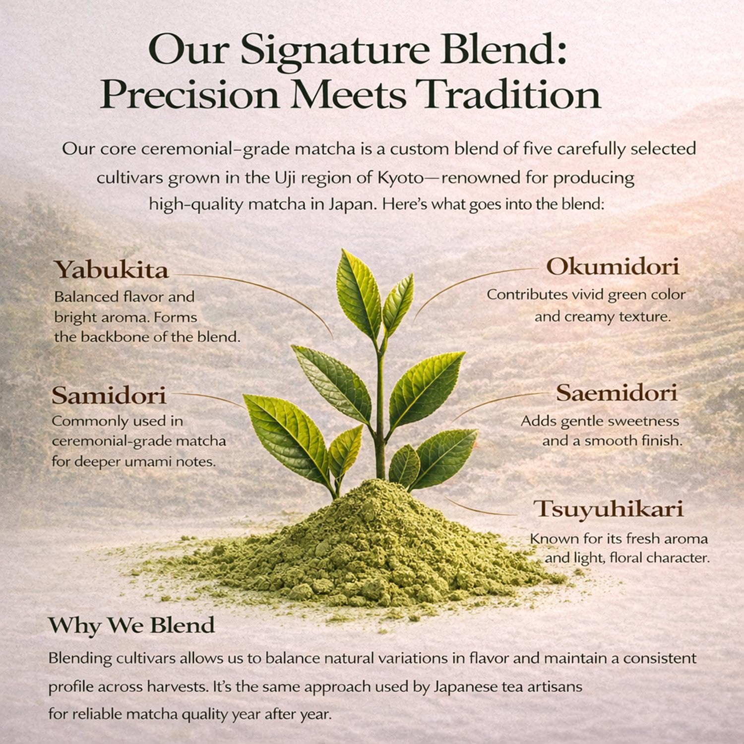 ✓ Our Signature Blend: Five Uji Kyoto Cultivars A custom ceremonial-grade matcha crafted from five carefully selected cultivars grown in Uji, Kyoto, for balanced flavor, vibrant color, and consistent quality. Yabukita – Clean, bright, and well-balanced foundation Okumidori – Adds creaminess and rich green color Samidori – Enhances umami with a refined finish Saemidori – Contributes gentle sweetness and smoothness Tsuyuhikari – Provides a fresh, lightly floral lift