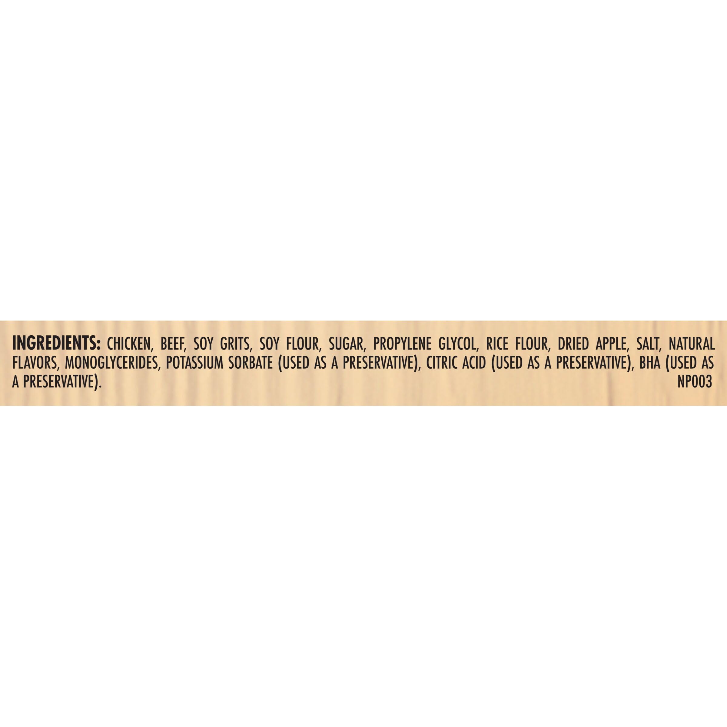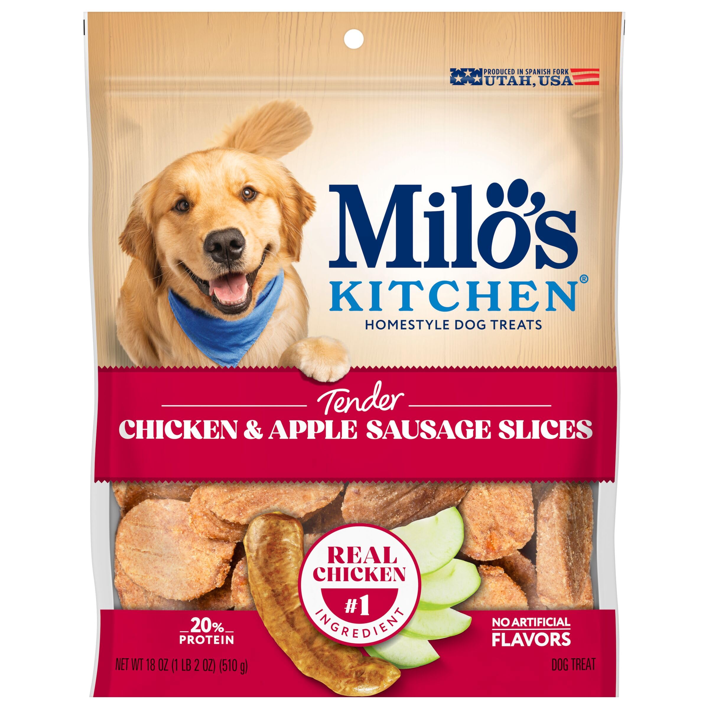 Contains one (1) 18-oz. bag of Milo’s Kitchen Chicken & Apple Sausage Slices dog treats