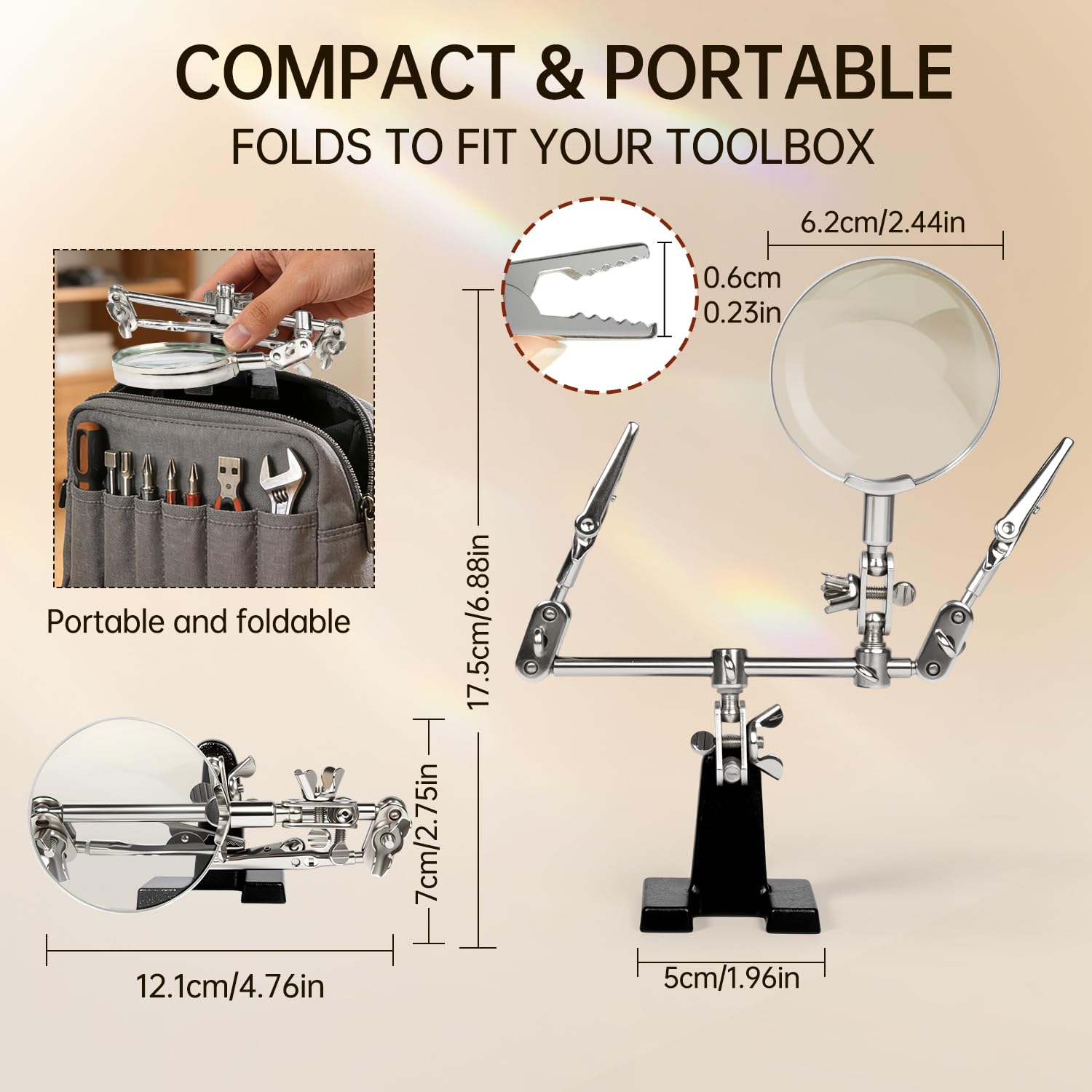 Magnifier Station Stand Tool --AORAEM Helping Hand Station are include with 2.5x Glass lens,2 alligator clips on 4-way swivels and adjustable magnifier and clips in various angles and heavyweight base.you will be able to make adjustments with ease as it can accommodate medium to small sized items.