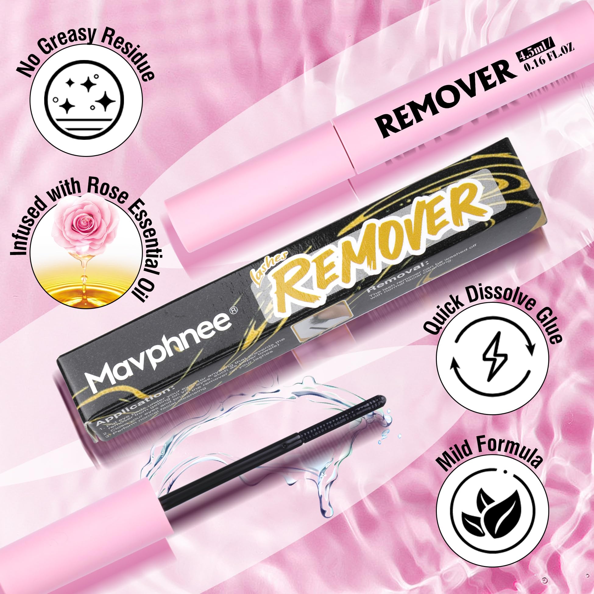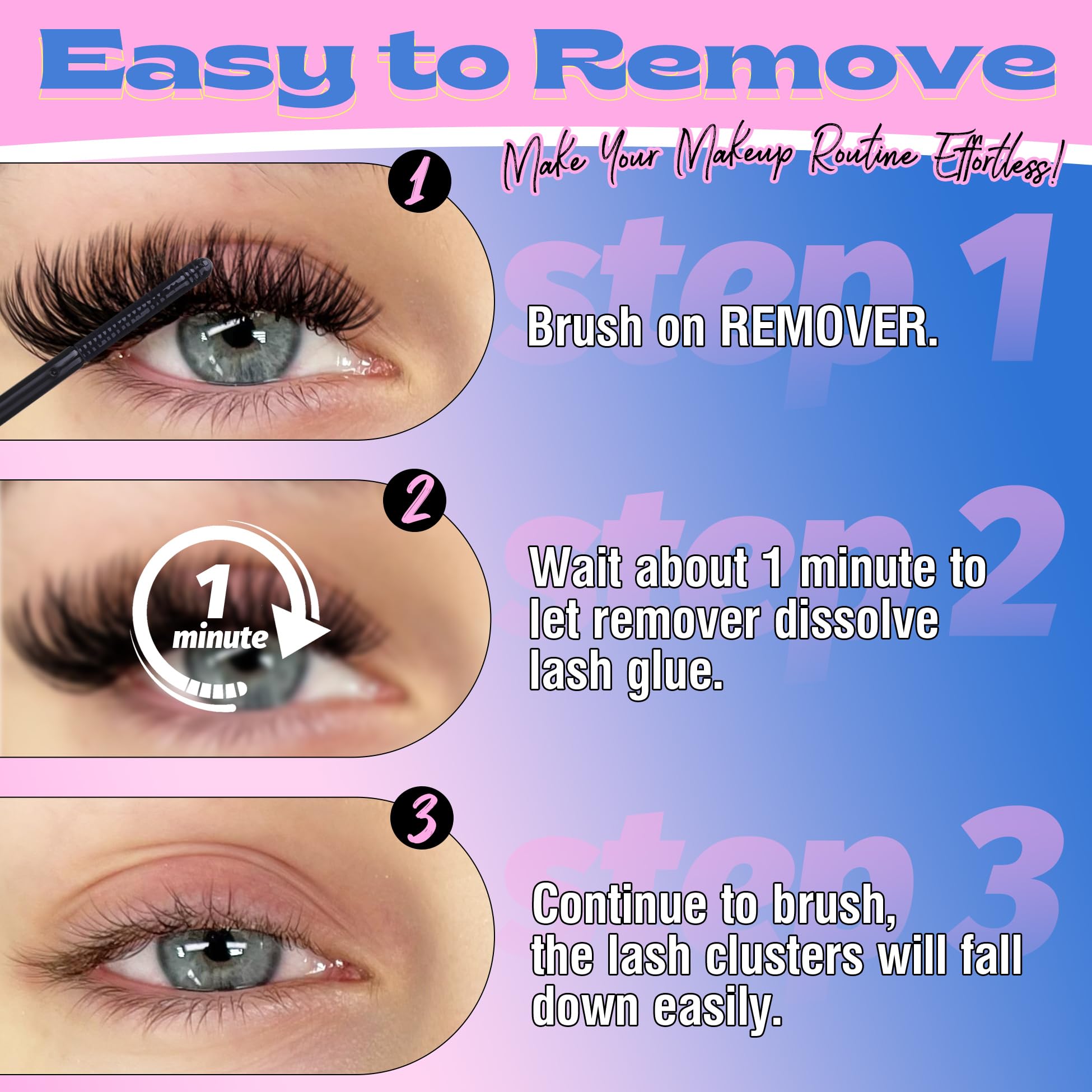 Gentle Remover: The lash remover is formulated with gentle ingredients that effectively break down the eyelashes adhesive without irritating your delicate eye area. It makes removing your lashes a breeze, allowing you to take off your false lashes without pulling or damaging your natural ones. This remover ensures a smooth and comfortable lash removal experience, maintaining the health of your natural lashes and skin.