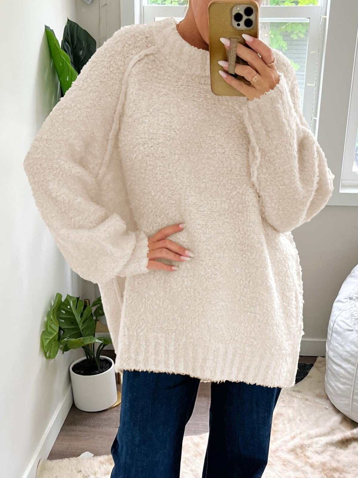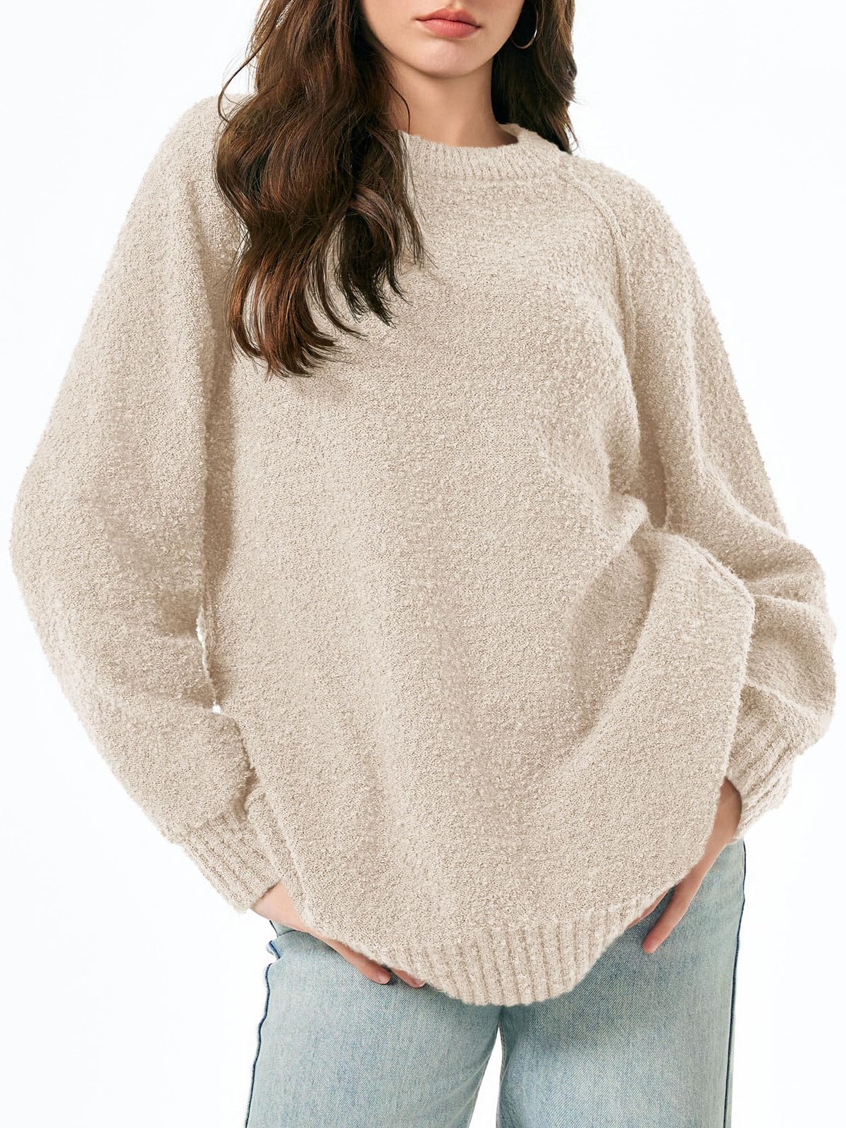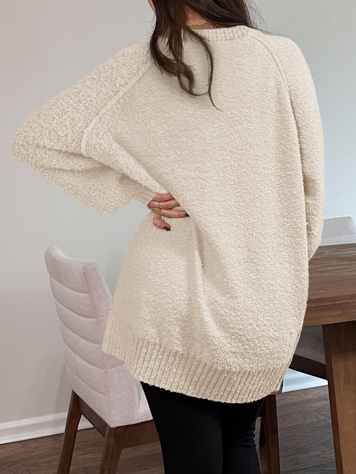 Features: Fuzzy fabric, oversized, long sleeve, ribbed knit hem, crew neck, drop shoulder, casual slouchy style, loose fit, solid color. The fuzzy sweater for women is good for early spring, fall and winter days.