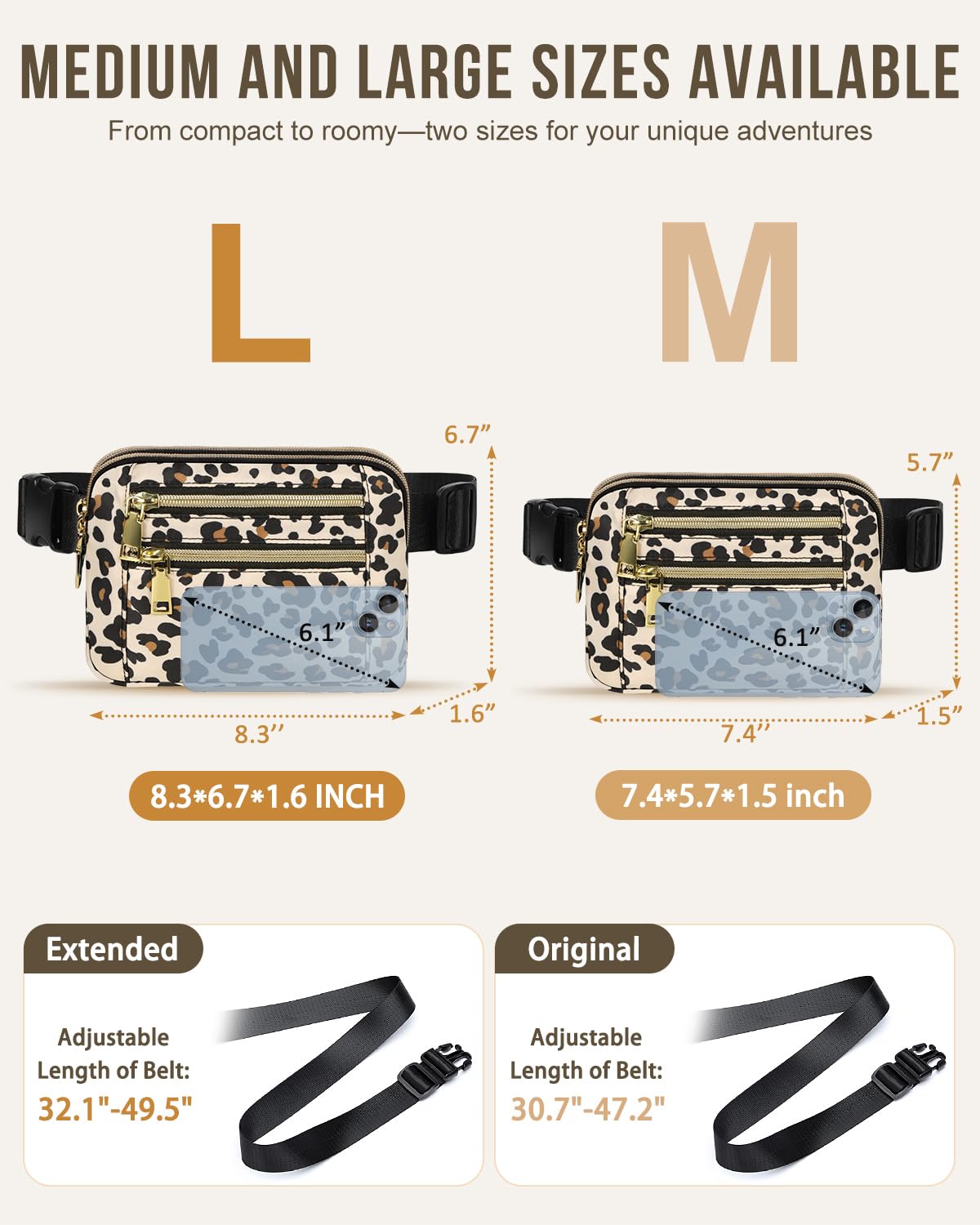 Large Capacity with 4 Zipper Pockets: Our waist packs are available in 2 sizes( L: 8.3*6.7*1.6Inch; M: 7.4*5.7*1.5Inch). Please measure your waist before purchasing. Features 2 roomy compartments and 2 mesh slots, so all your essentials stay neatly organized and easily accessible. Say goodbye to digging through your bag! 2 zippered front pockets are designed to store keys and cards without worrying about the keys scratching your phone
