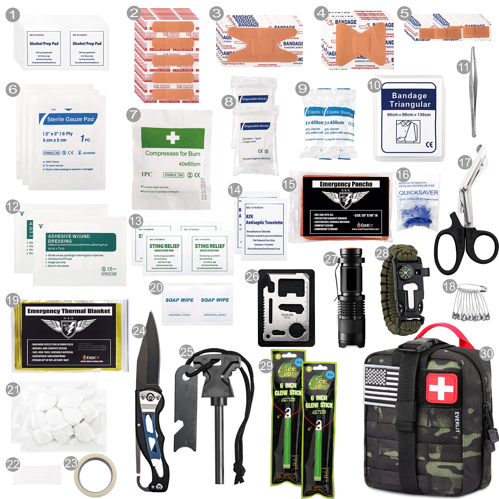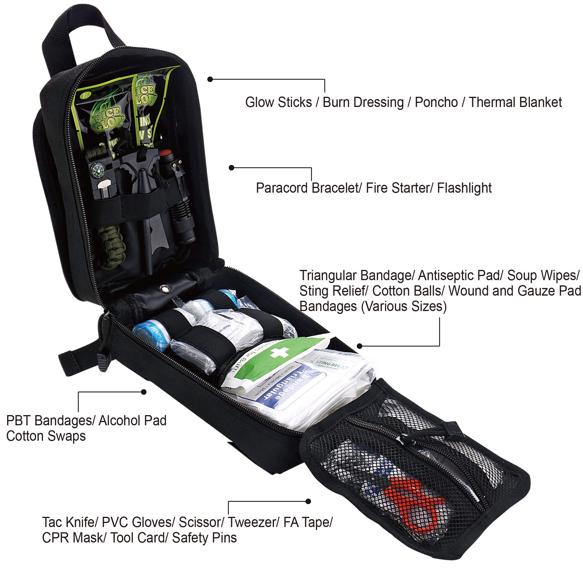 ✅【Top Quality Survival Gears Safeguard Your Next Adventure】Stuffed with the most essential survival gadgets: mylar space blanket, 3-mode tactical flashlight, multi-function paracord bracelet (compass, whistle), flintstone, knife, saber card, two 12 hour glow sticks and emergency rain poncho.