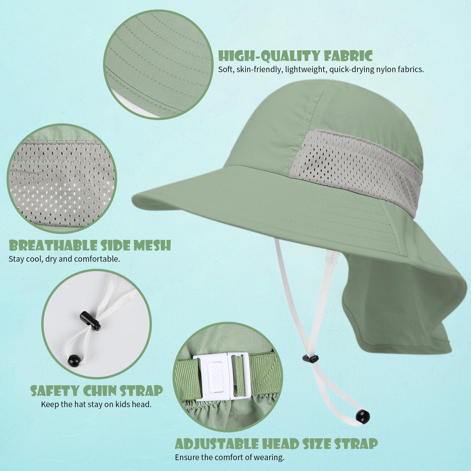 GREAT SUN PROTECTION: The kids sun hat features highest rated UPF 50+ sun protection, which blocks up to 98% of UVA and UVB Rays! Its 3" wide brim and 5.4"long neck flap help to cover kid's face, ears, back and neck, thus protecting the delicate skin from sun burn better