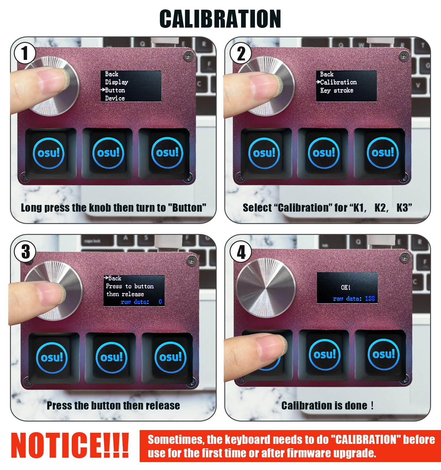 【NOTICE】Sometimes, the keyboard needs to do "CALIBRATION" ( The steps are shown in the figure ) before use for the first time or after firmware upgrade.