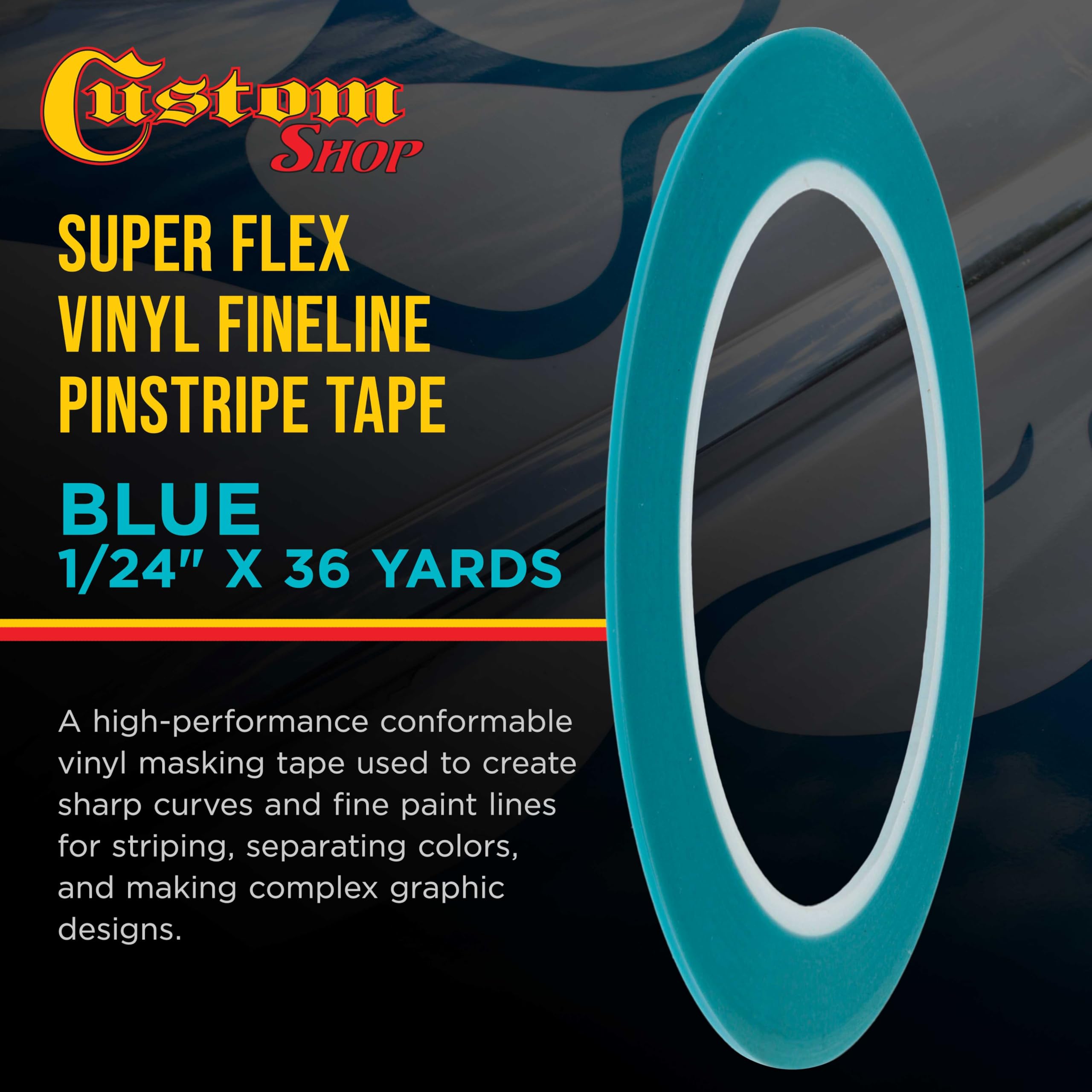 Custom Shop Super Flex Vinyl Fineline Pinstripe Tape, Blue 1/24" x 36 Yard Roll. A high-performance conformable vinyl masking tape used to create sharp curves and fine paint lines for striping, separating colors, and making complex graphic designs.