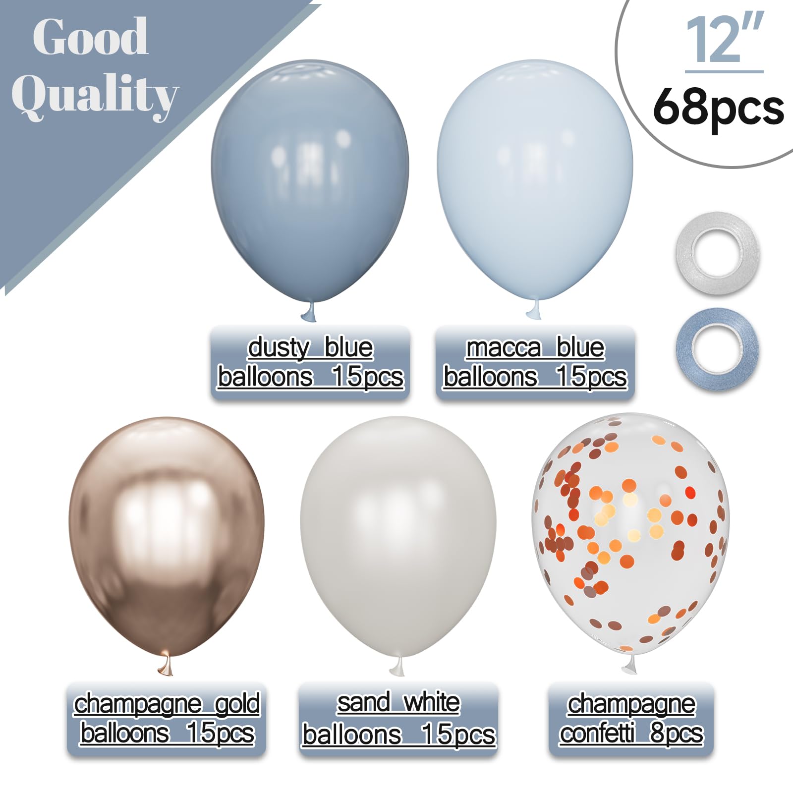Simple balloon pack: Contains 68 pieces of 12-inch latex balloons, including 15 metallic Champagne Gold balloons, 8 Champagne confetti balloons, 15 white sand balloons, 15 baby blue balloons, 15 Dusty Blue Balloons latex balloons, and 2 ribbons.