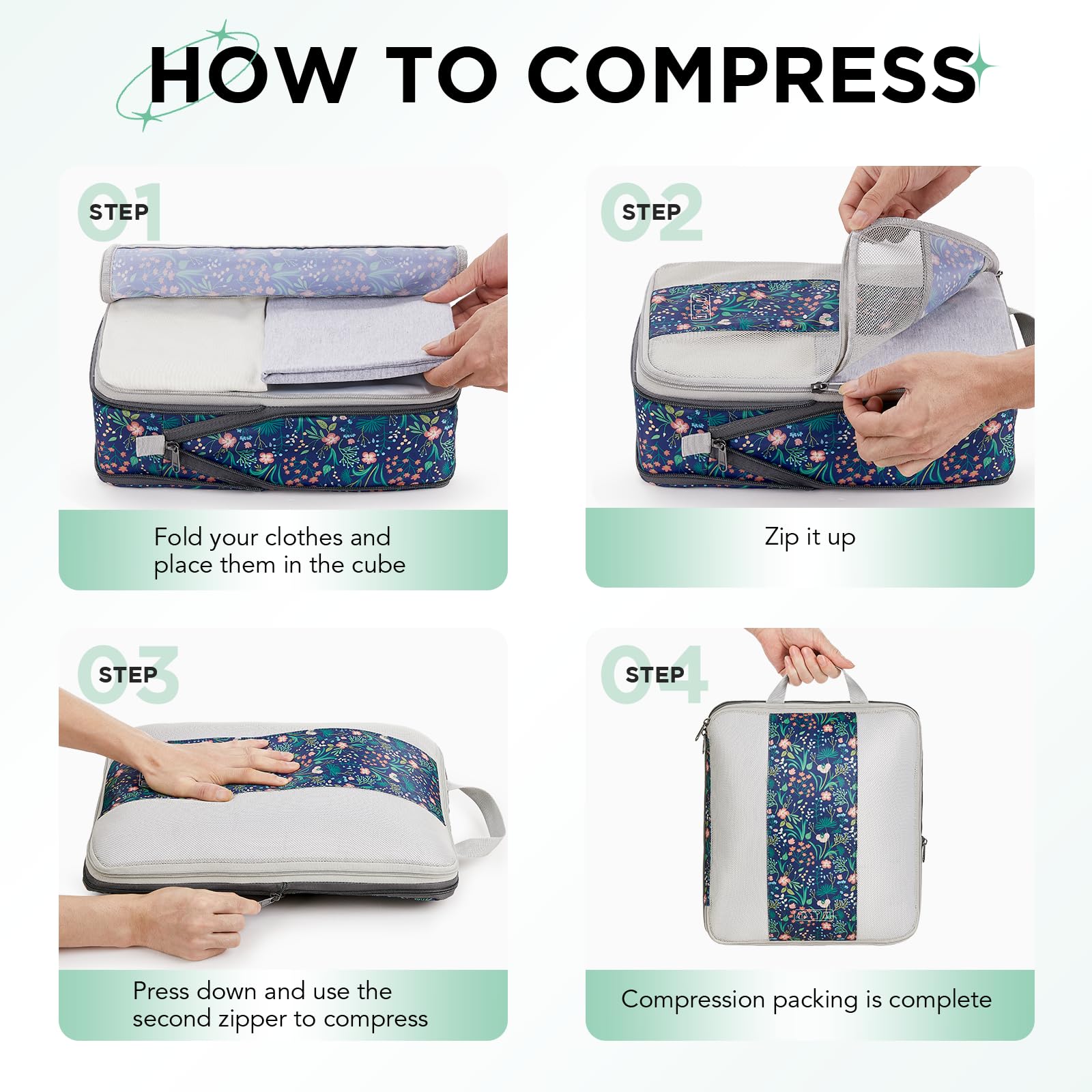 Maximize Packing Efficiency - Make every inch of your luggage count! These compression cubes work like a mini vacuum sealer, using an extra outer zipper to reduce bulk and create more space. Pack more clothes without sacrificing options—your favorite outfits, now travel-ready.