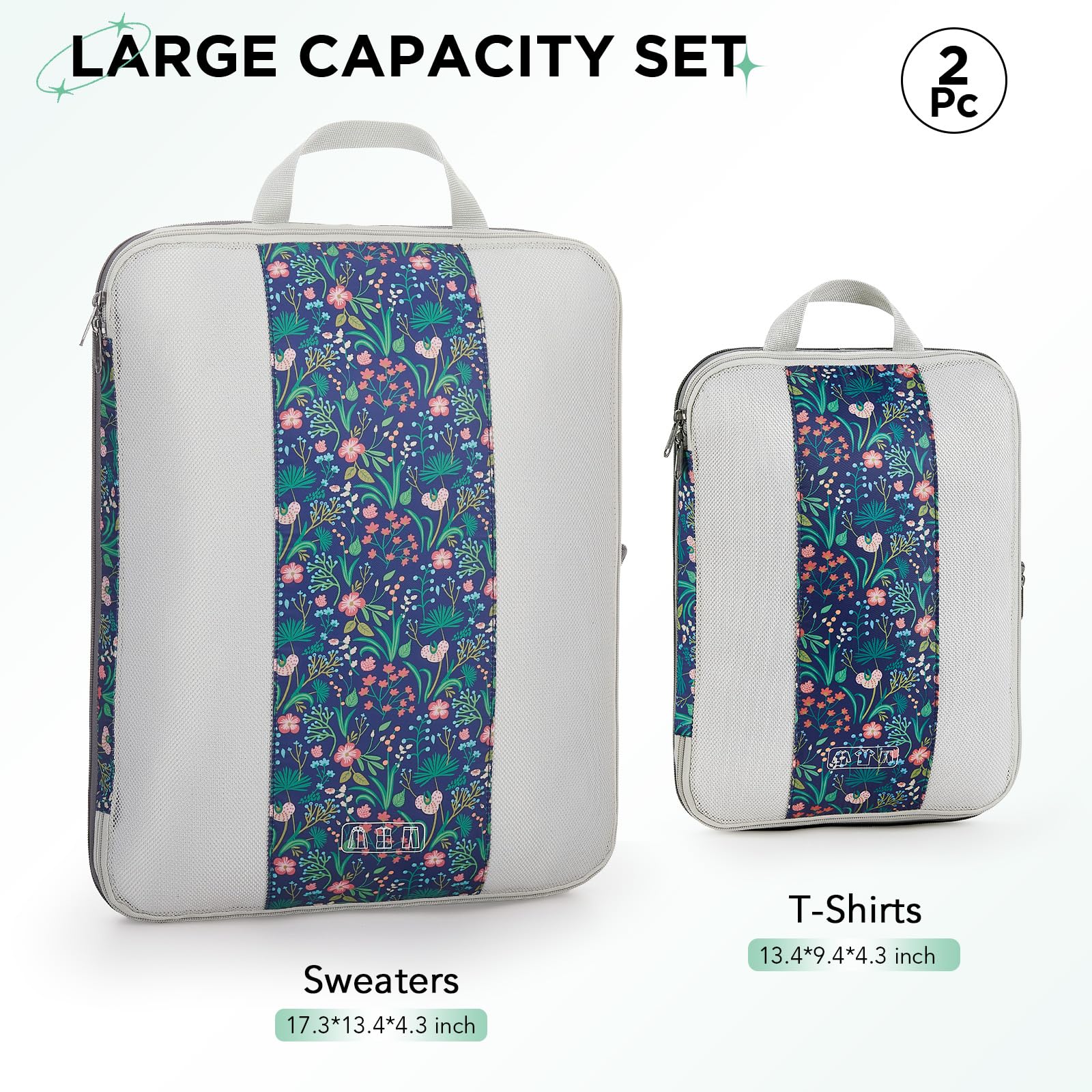 2-Piece Set for Lightweight Travel — Your Best Companion for Carry-On Luggage! This 2-piece compression packing cube set includes XL and M sizes. The XL cube is perfect for bulky items like coats, sweaters, and jeans, while the M cube is ideal for medium and small clothing such as T-shirts, shorts, and tops. With our two-piece set, say goodbye to a disorganized suitcase forever!