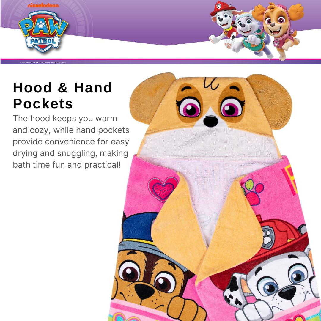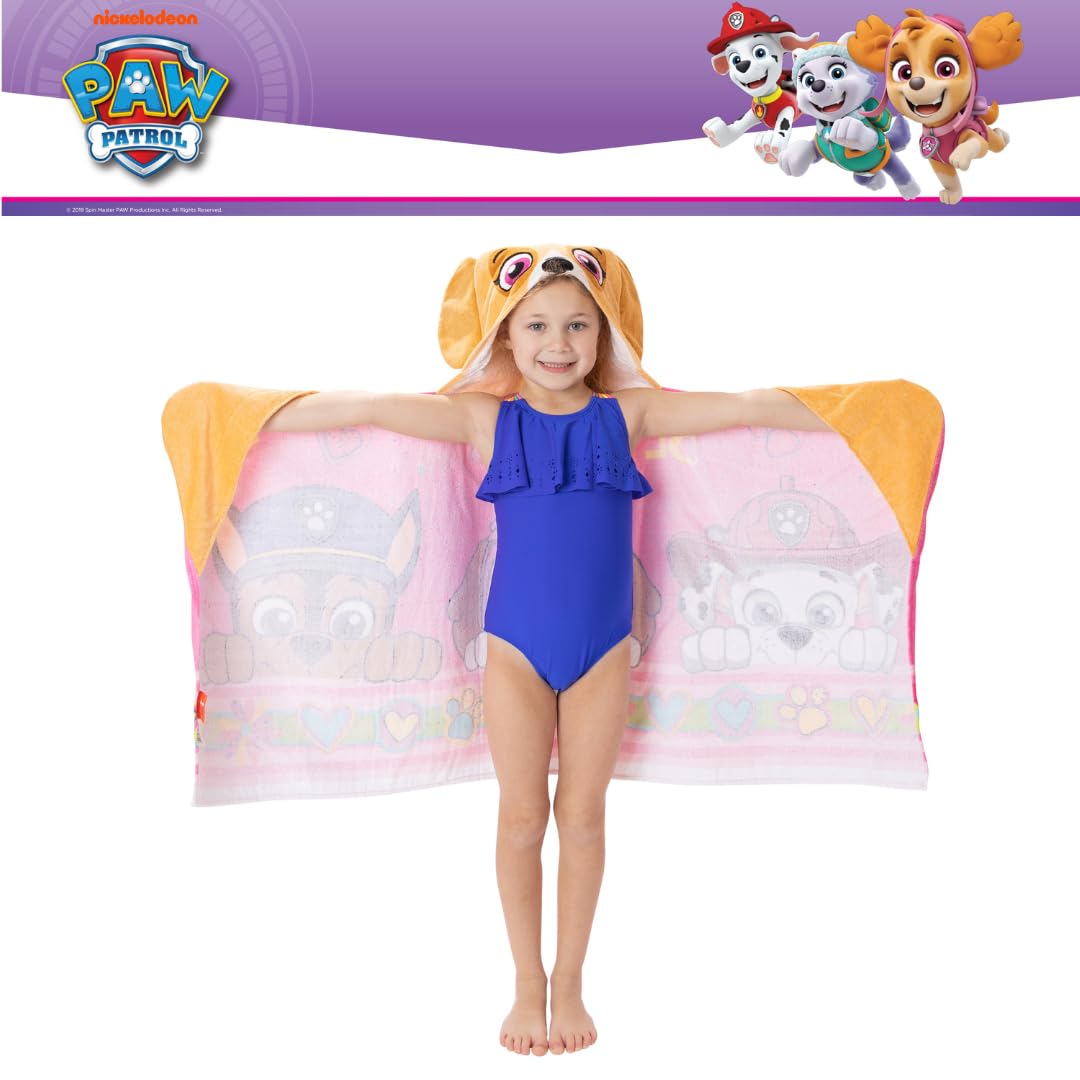 PAW PATROL GIRLS DESIGN: Paw Patrol adds style to this cute & cuddly hooded towel. Wrap your child up with colorful imagery of Marshall, Chase & Skye. 3D ears and Skye detailing on this charming towel help bring the beloved Nickelodeon characters to life