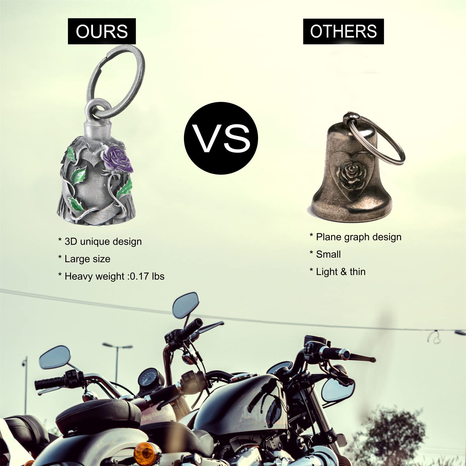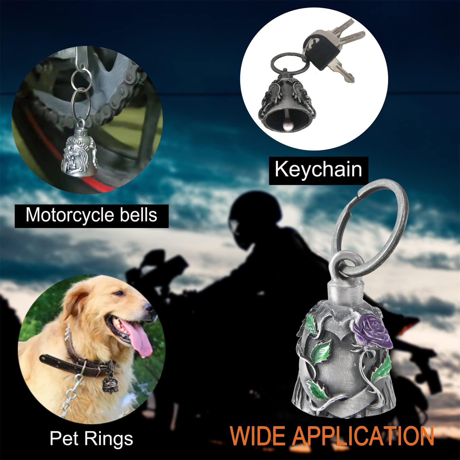 Multi use:This motorcycle biker bells are multi usage, it could be hang on motorcycle for safe and lucky, can hang on pet lease ,and can be a keychain for luck.