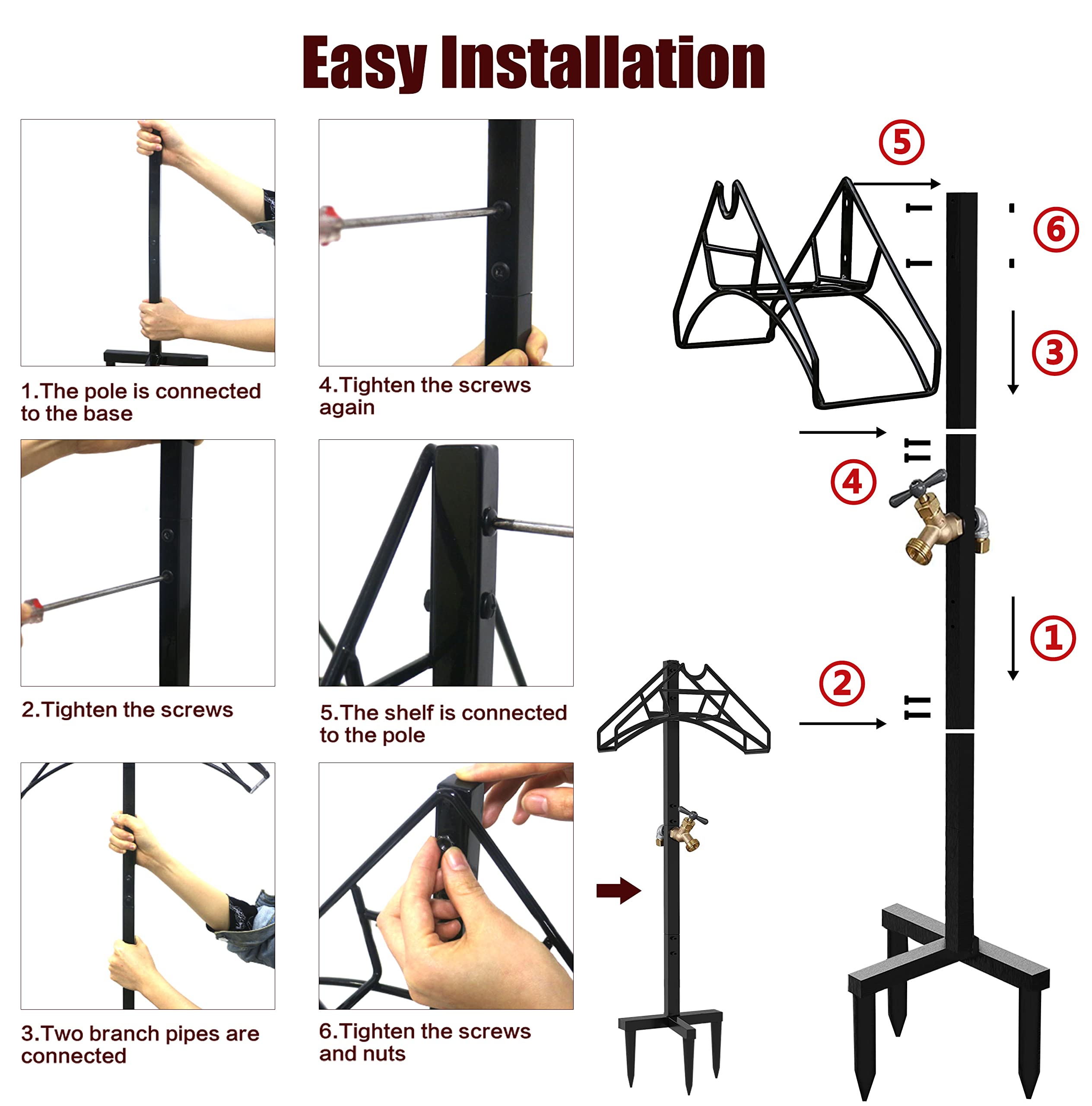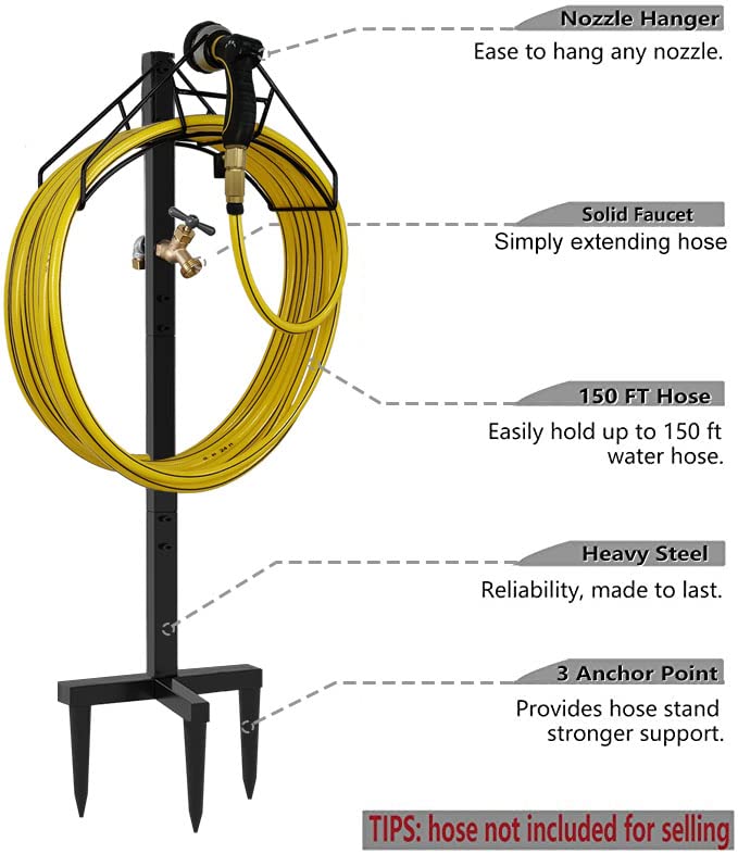 Free standing and High Stability: Different with wall mounted hose hanger or hose cart, hose mobile reel, hose butler, outside hose pot keeper and hose caddy, this free-standing hose stake comes with the total height of 43.5 inches and three stable anchor points, provides the hose organizer stronger support and keeps the large capacity up to 150 ft standard hose (hose not included) firmly in place, no messy, no dirty, saves space, makes hose organize