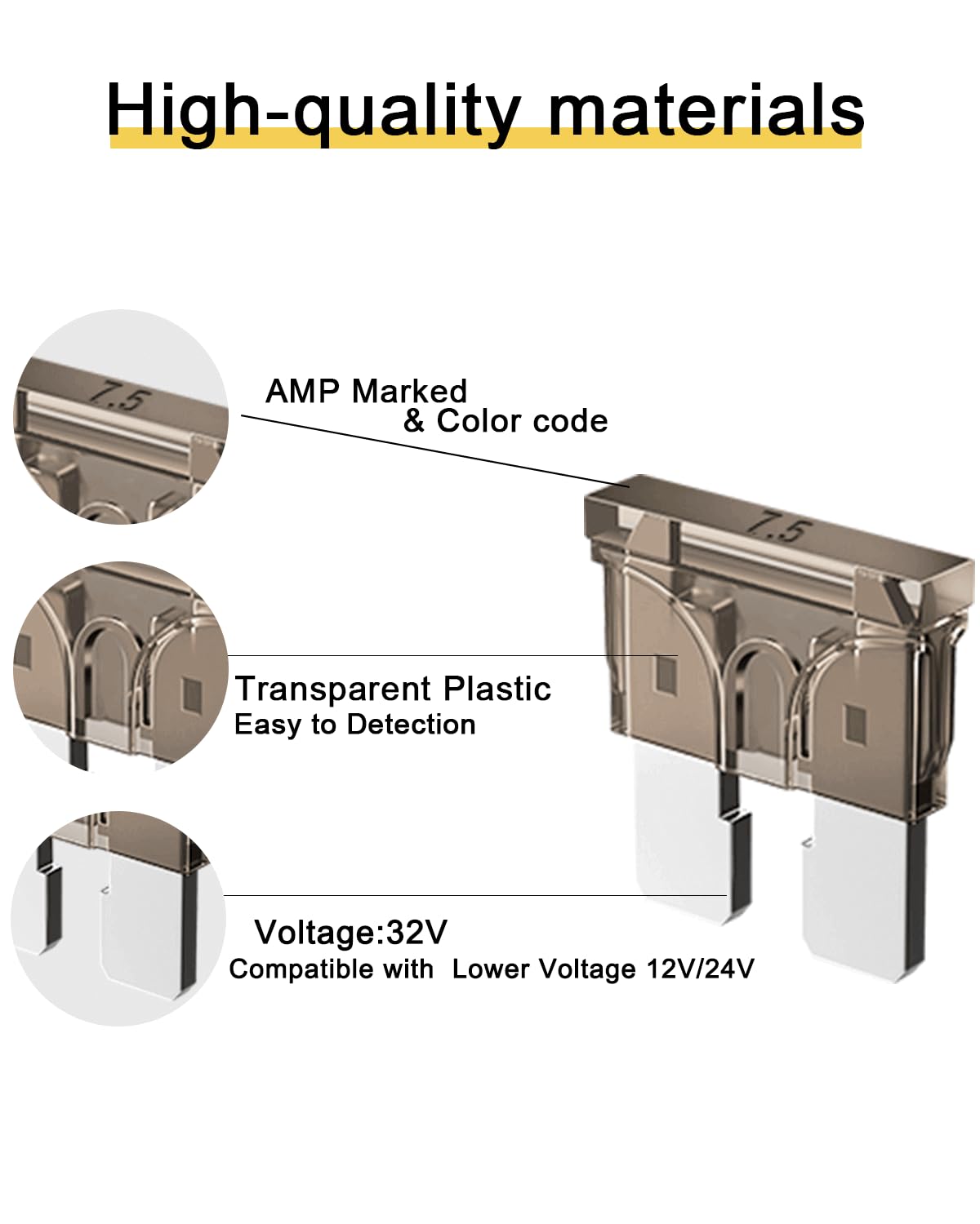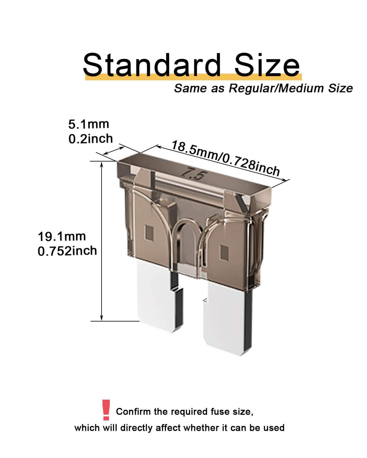 Product Details & Tips - Voltage:32V, Current: 7.5A, Size: Standard/Regular (This fuse can compatible with lower voltage 12V/24V, but the CURRENT and SIZE must be accurate, Check your desired size and current, which determines whether it can work.)
