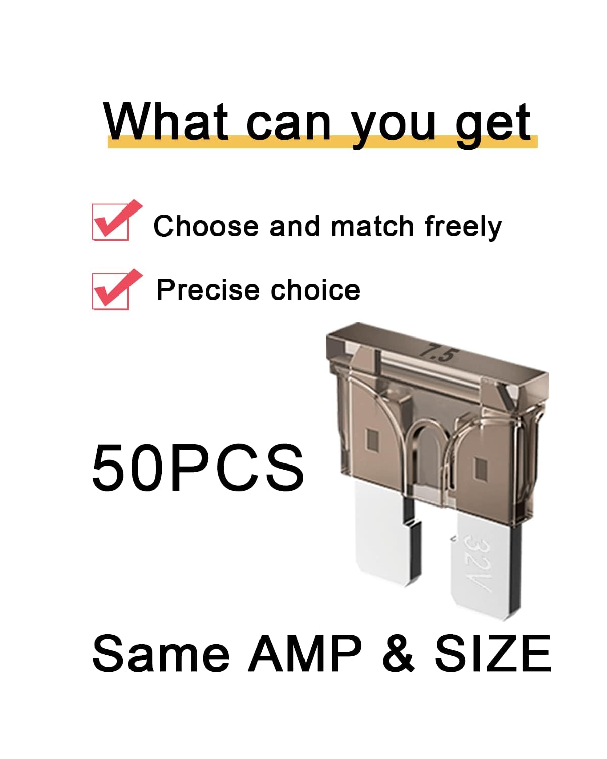 Freely Choose - 50pcs Standard car fuses of the same current per pack, this item is 7.5 amp car fuse. You can freely match your need for AMP fuse. Avoid that some AMP car fuses are not enough, others are completely useless.
