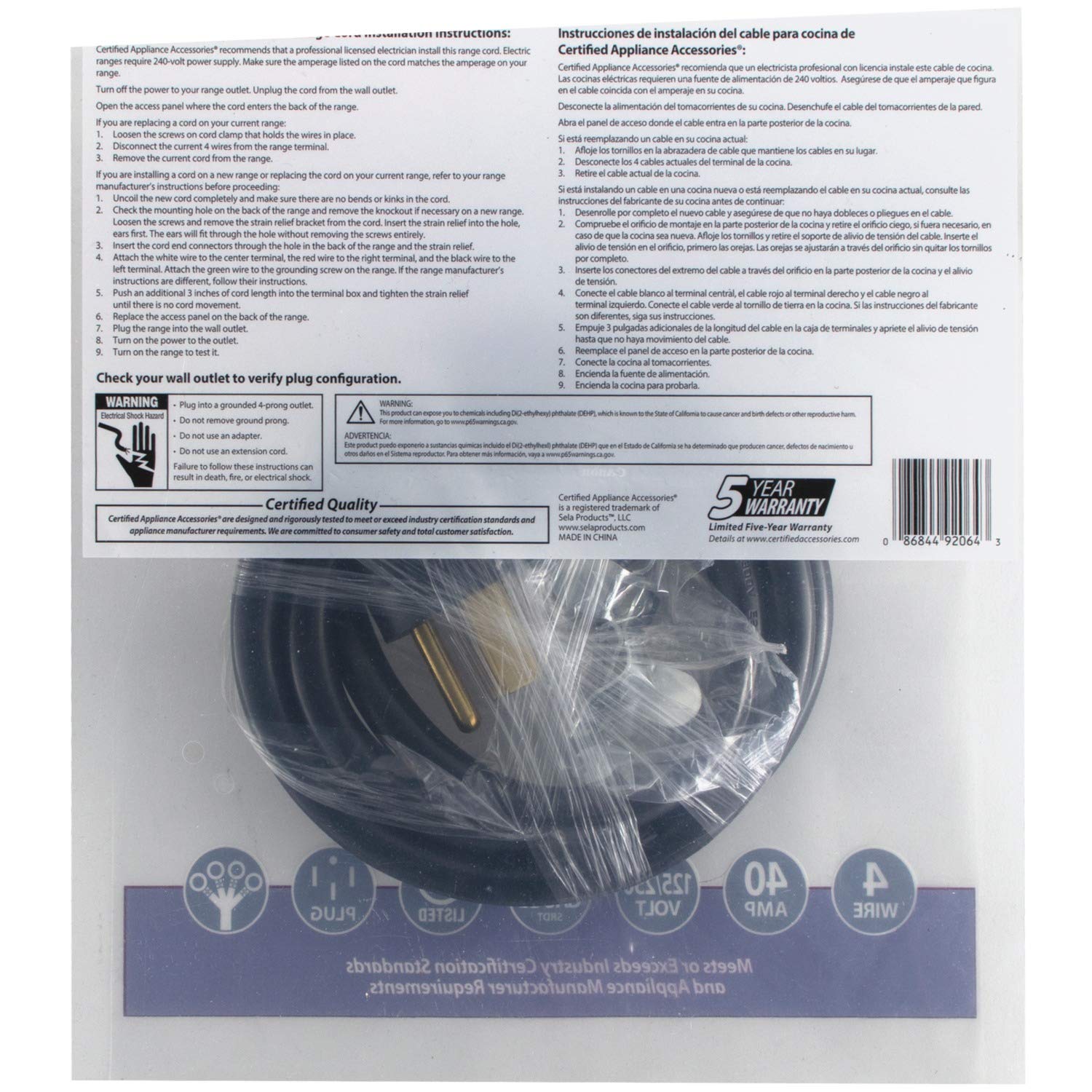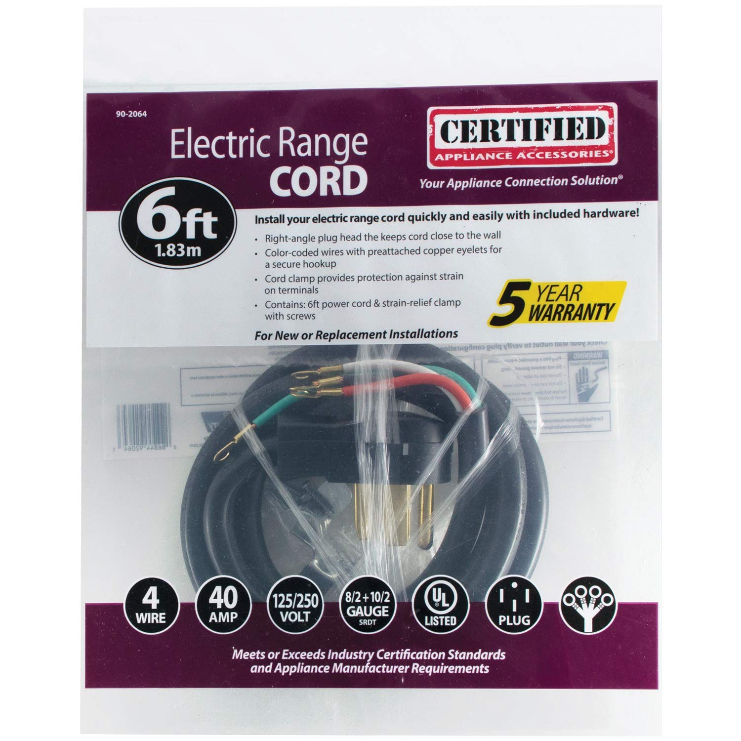 Product Description For years, licensed plumbers, electricians and appliance installers have relied on Certified Appliance Accessories for their power cords, hoses and connectors. Now you can too. Enjoy the convenience offered by this range cord from Certified Appliance Accessories. Its flexibility and durability ensure a reliable connection for your next home installation project. This high-quality range cord has been thoroughly tested and is backed by a 5-year limited warranty. Follow our illustrated, step-by-step directions included in the packaging. Always consult your appliance’s installation instructions. Check your appliance's manual for the correct specifications to ensure this is the right cord for you. Thank you for choosing Certified Appliance Accessories—Your Appliance Connection Solution. From the Manufacturer 4-wire range cords are 40 Amps and 6 feet in length and are UL listed.